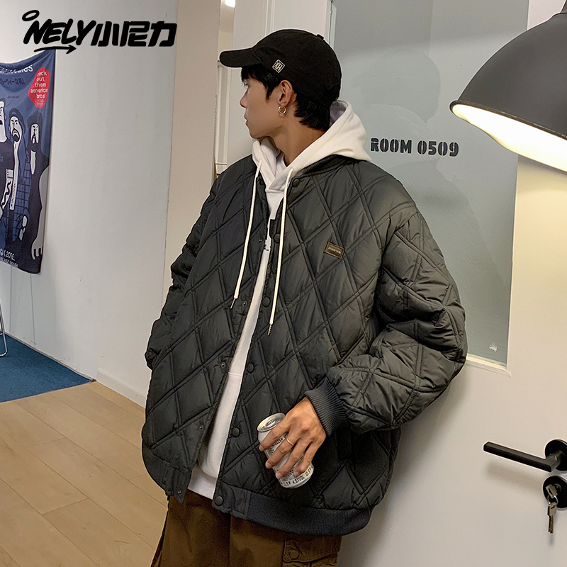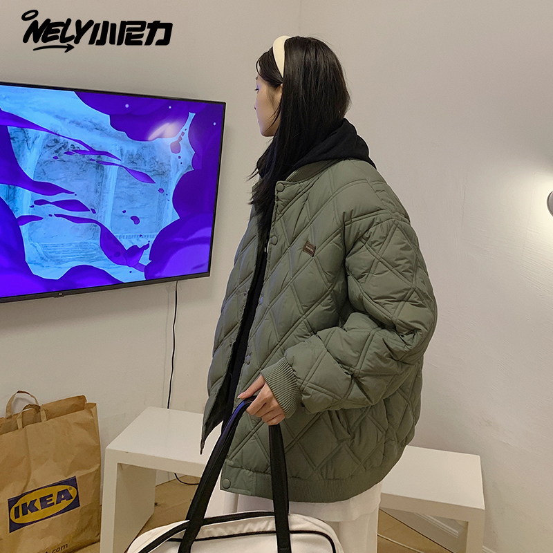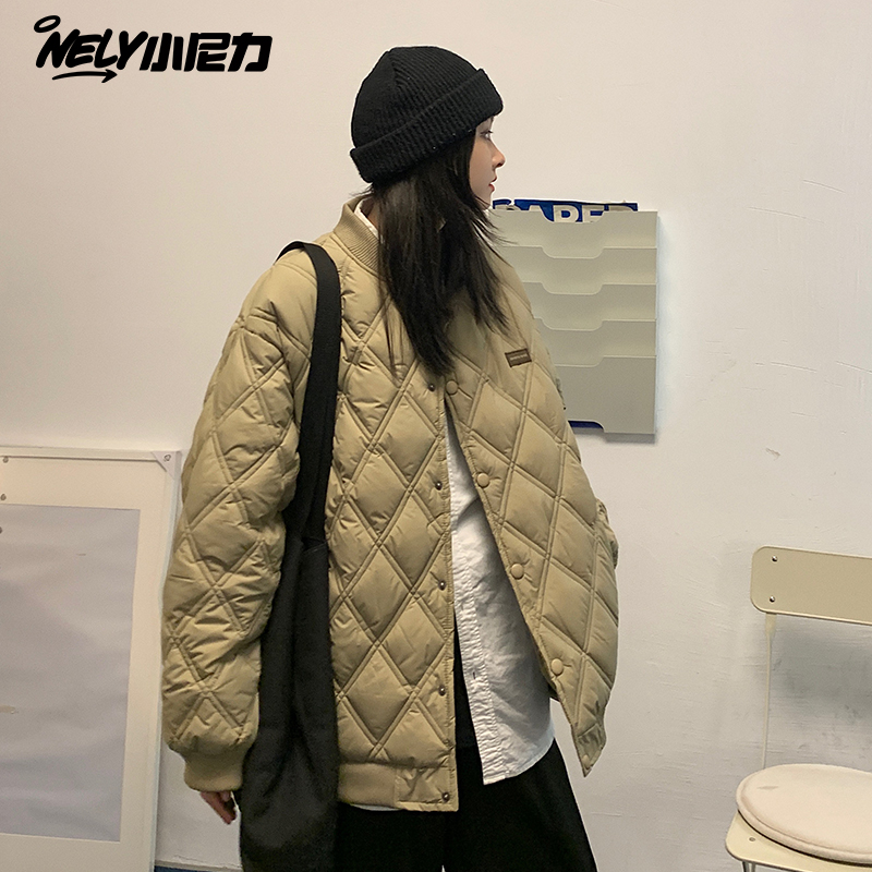 淘宝NELY小尼力秋冬季新款棉衣男女棒球领菱形格夹棉外套运动防寒棉服