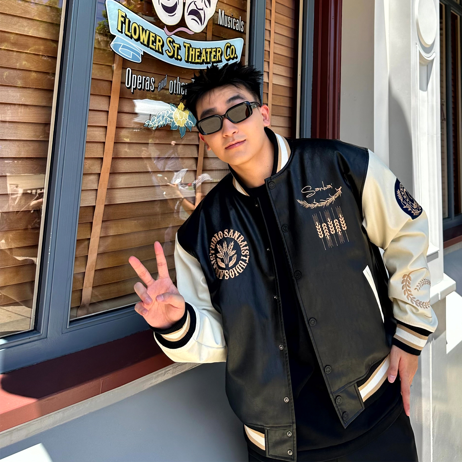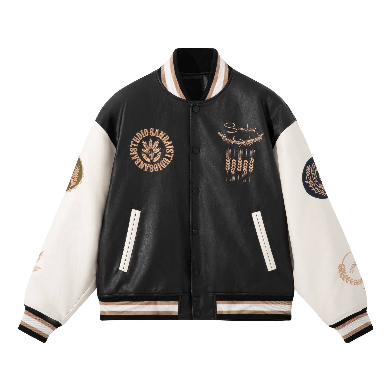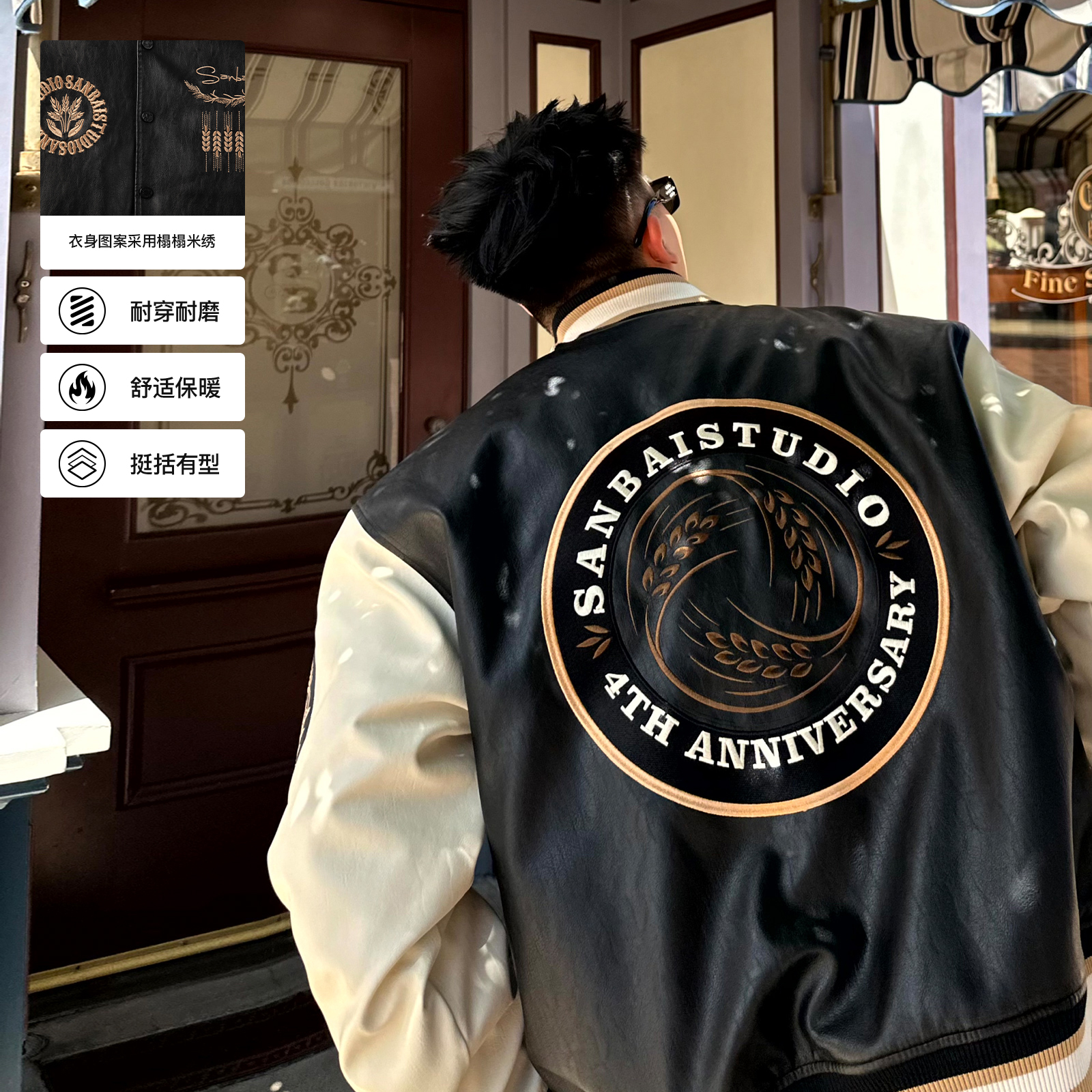 淘宝SANBAI 叁佰战斗学院黑色棒球服皮衣夹克外套男冬季新款美式棉衣