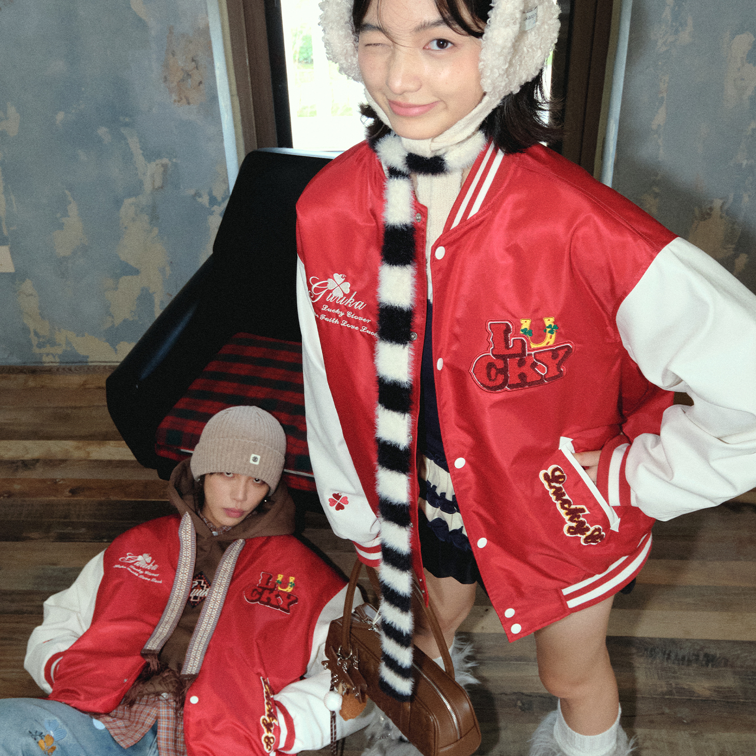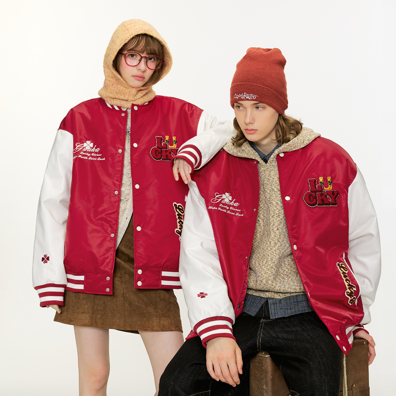 BJHG不计后果新年红夹棉棒球棉服男款冬美式运动棉衣圣诞节外套女