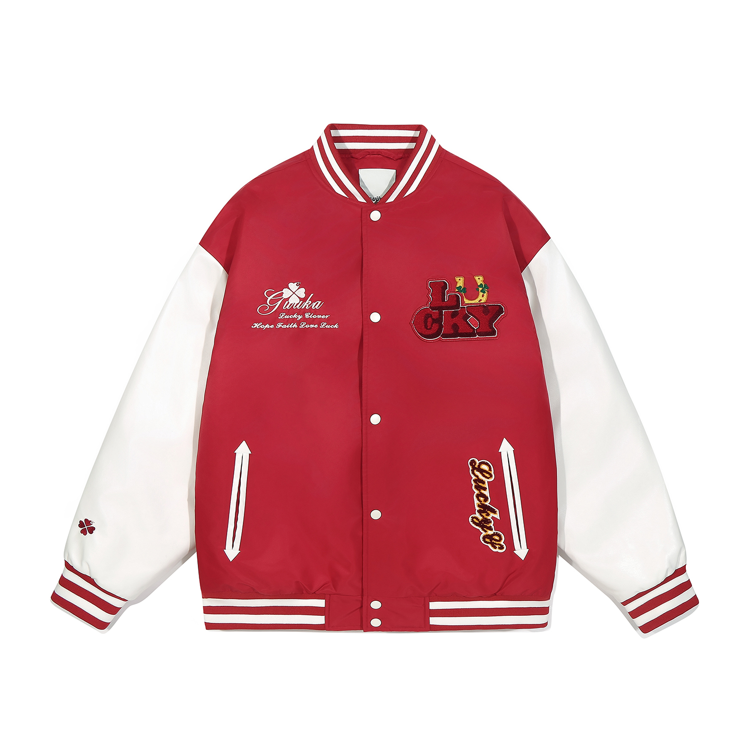 天猫GUUKA美式刺绣红色棒球服外套男款棉服 冬季拼接PU皮落肩棉衣