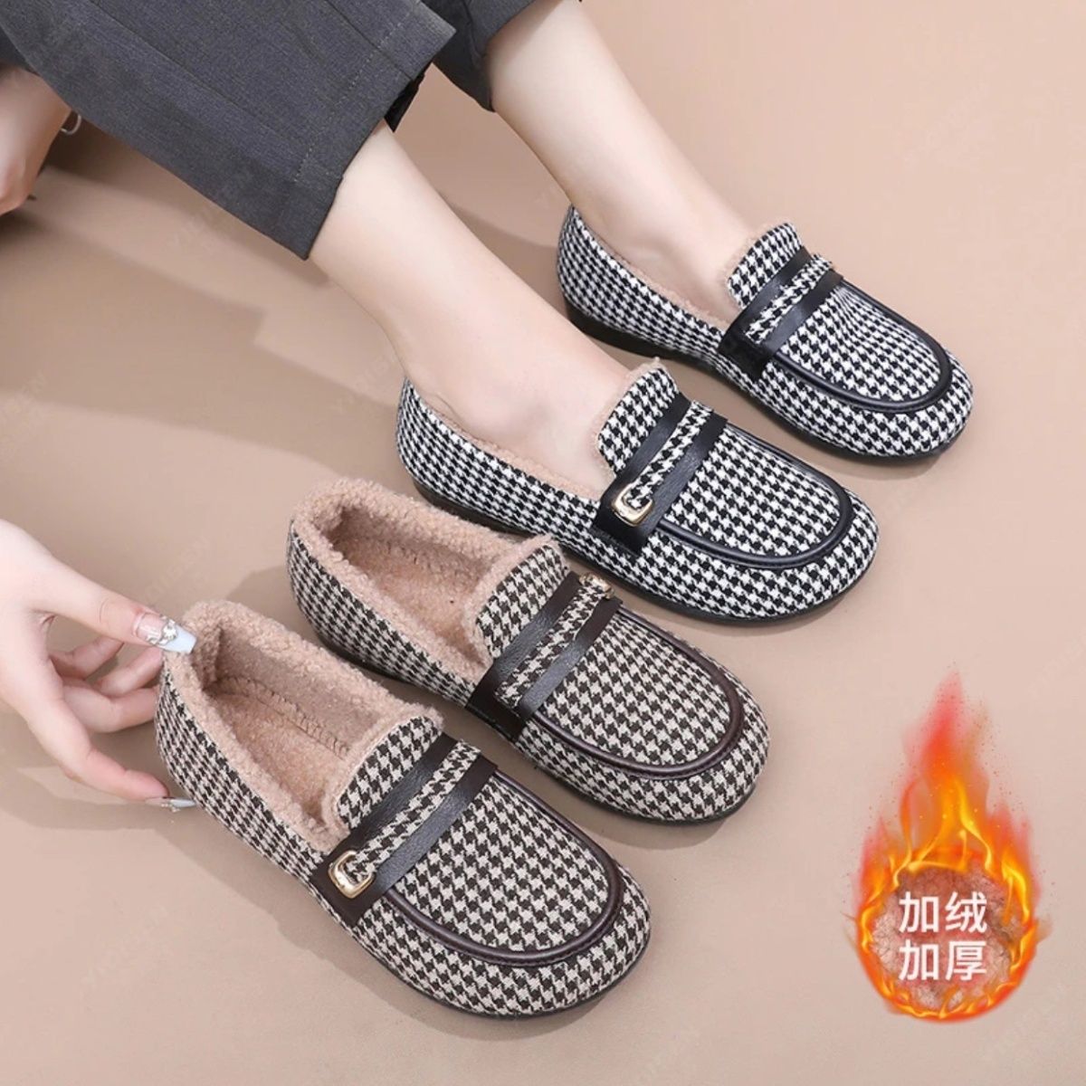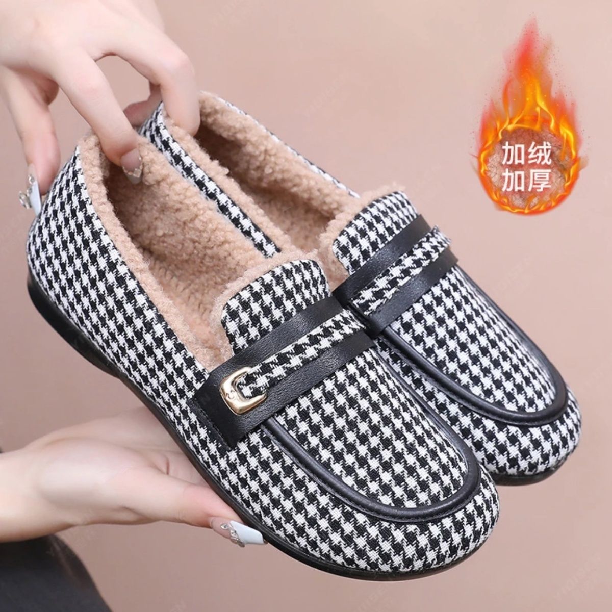 淘宝冬季加绒豆豆鞋女平底保暖时尚老北京布鞋软底棉鞋防滑休闲妈妈鞋
