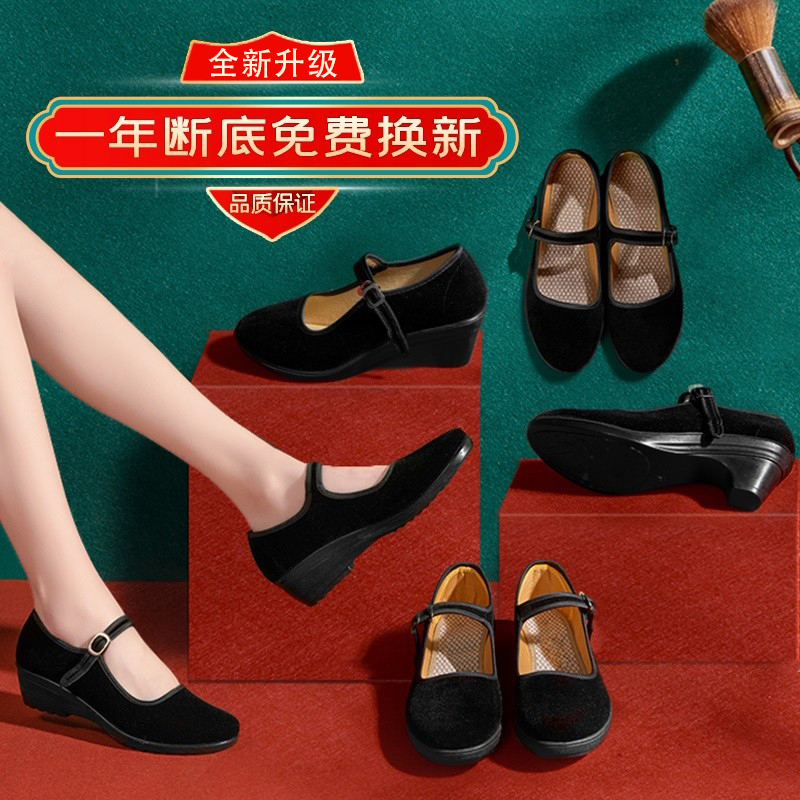 老北京布鞋女软底工作鞋黑色中跟酒店防滑厚底广场舞蹈鞋女跳舞鞋