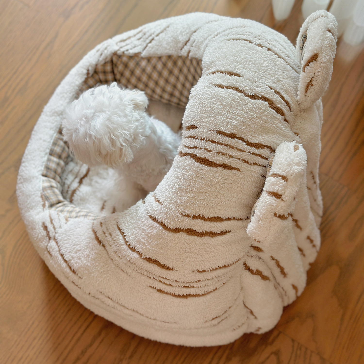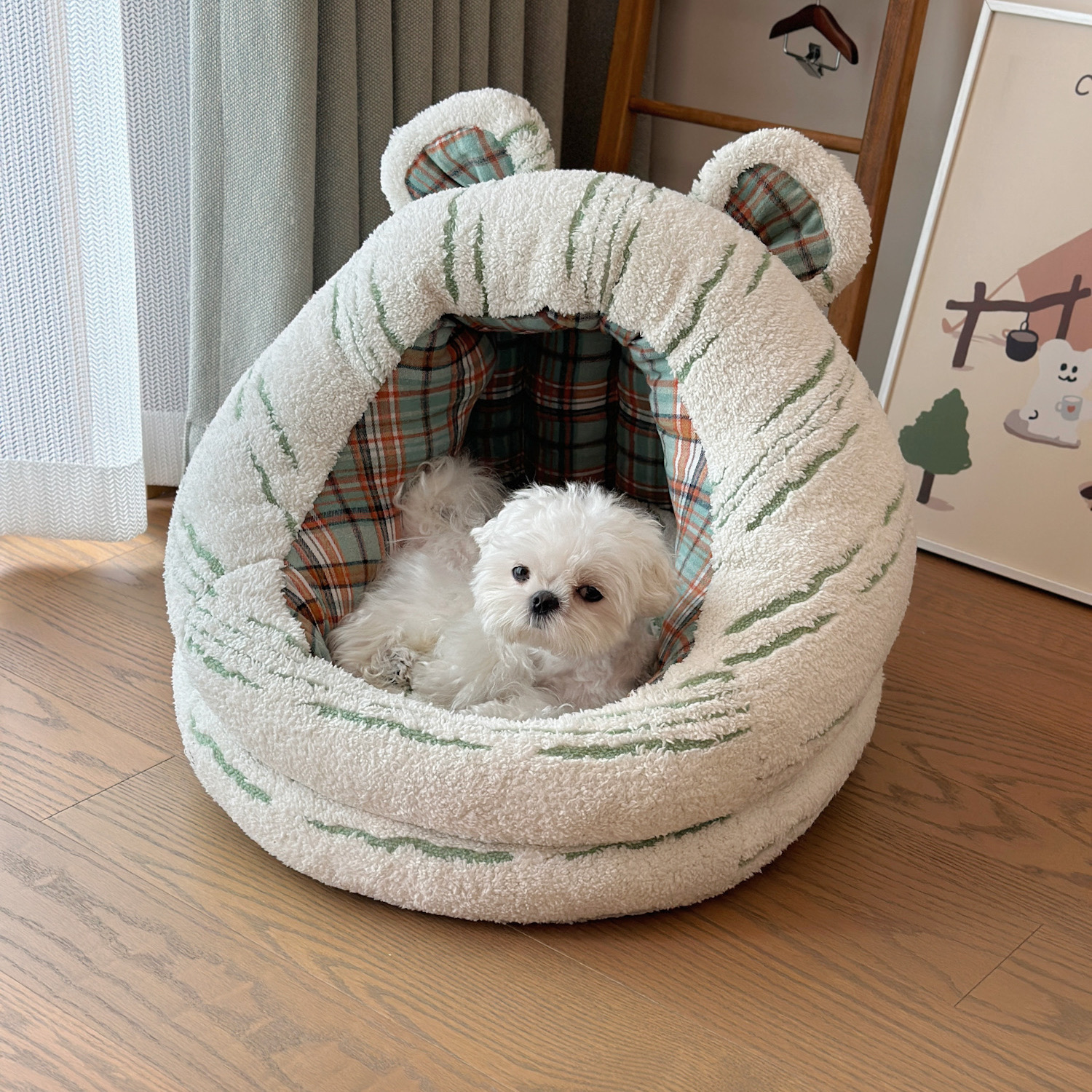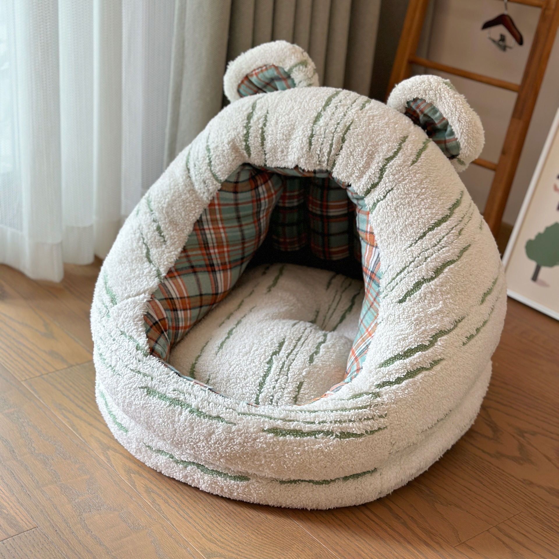 PetMan元气熊熊宠物窝侘寂奶油风床加厚猫狗窝含2个枕头宠物小屋