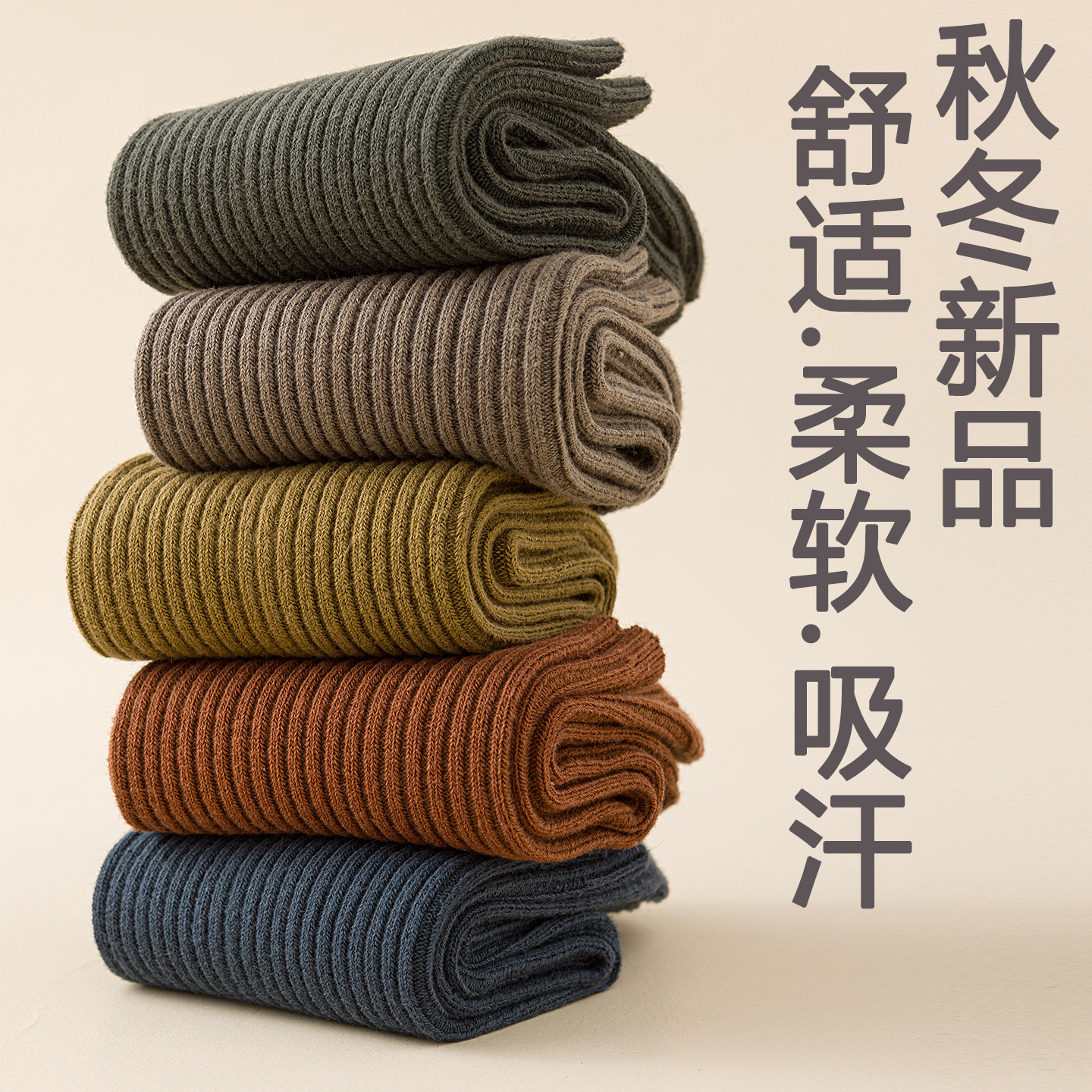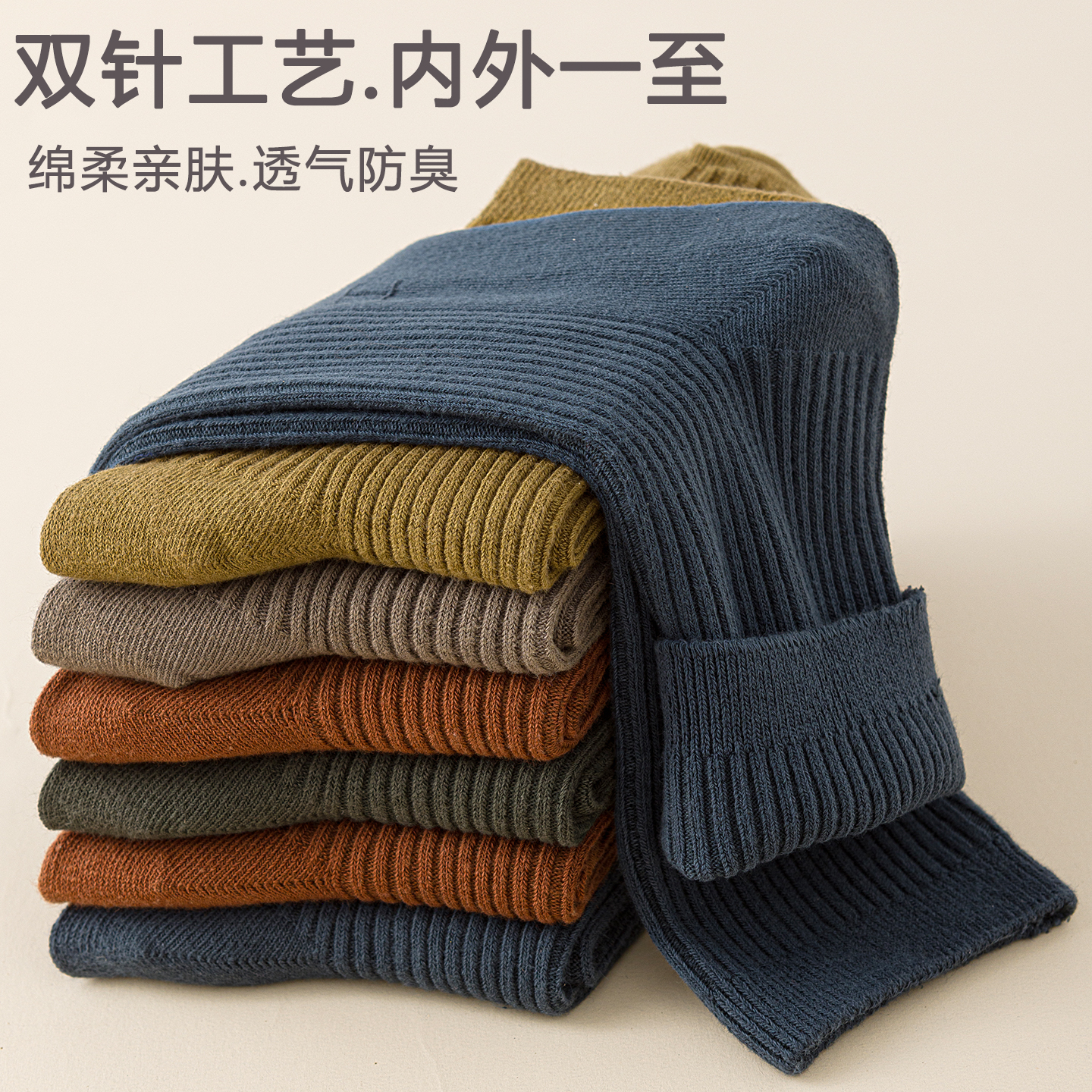中筒男袜双针秋冬季加厚纯棉袜纯色吸汗商务男款防臭抗菌长棉袜