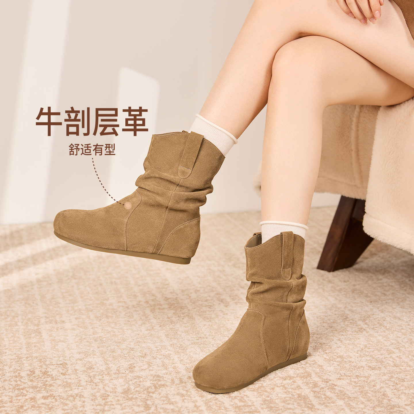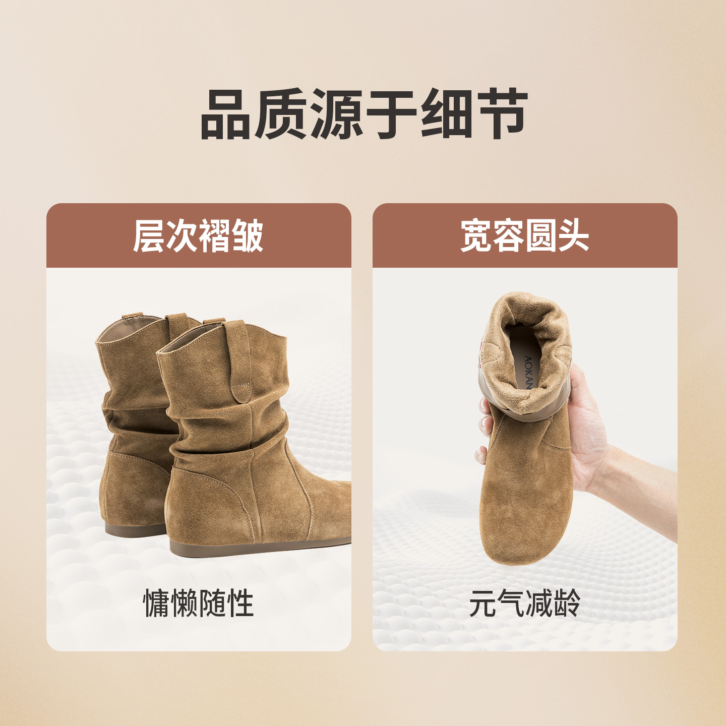 天猫奥康 女鞋2025冬季新款真皮平底西部堆堆靴巴恩风女短靴门店发货