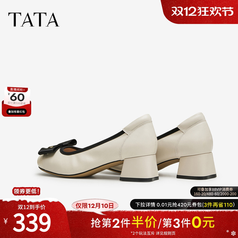 天猫TATA他她粗跟单鞋女鞋一脚蹬浅口晚晚鞋通勤百搭2024冬季X8MA5CQ4