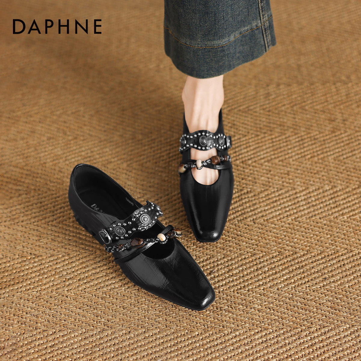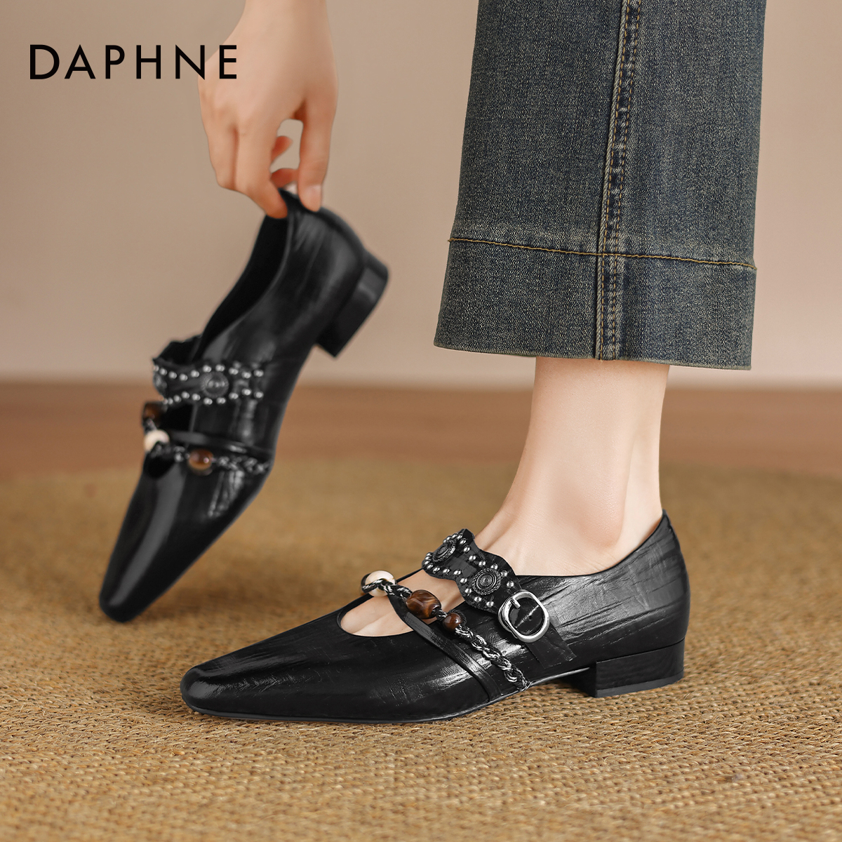 天奥康女鞋春秋复古方扣百搭黑色小皮鞋时尚套脚乐福鞋门店发货