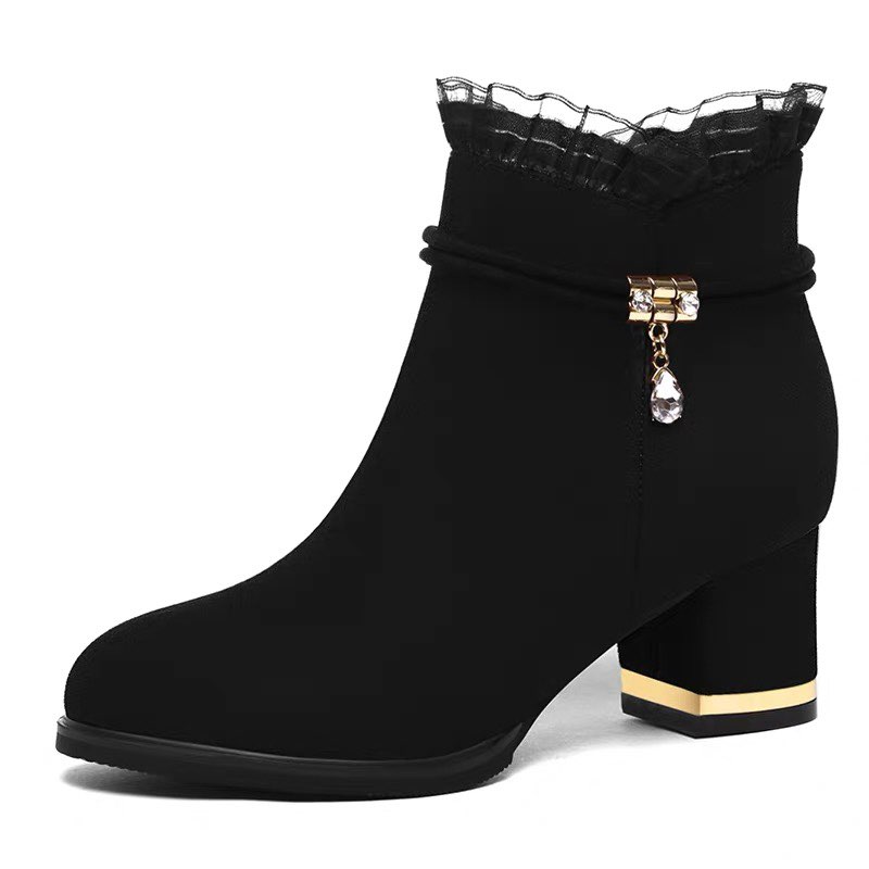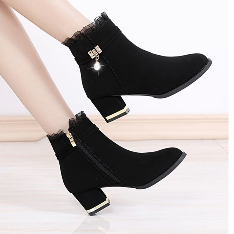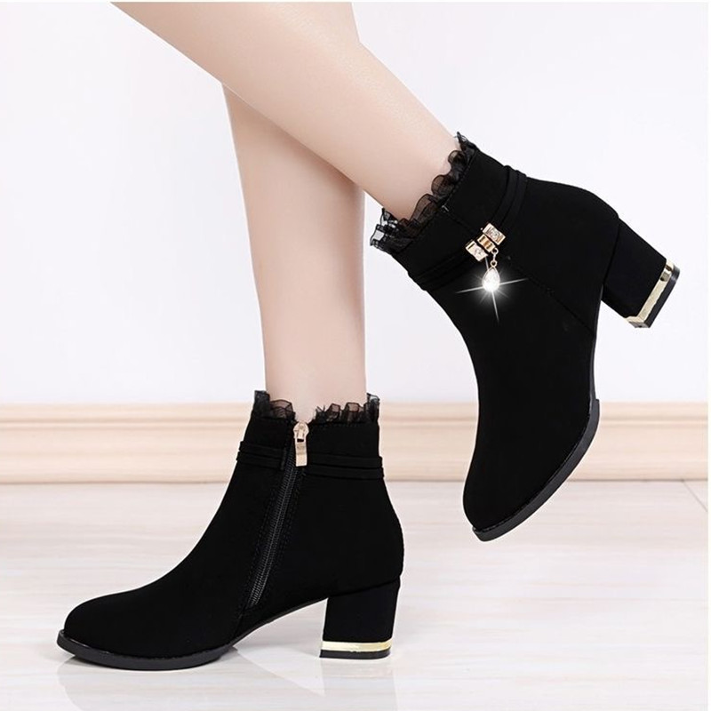 淘宝断码清仓磨砂中跟短靴女士蕾丝2025秋冬新款粗跟加绒保暖真皮棉靴