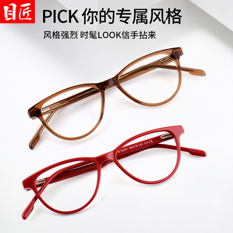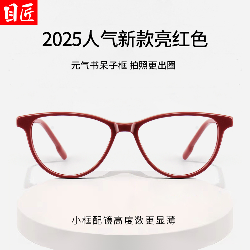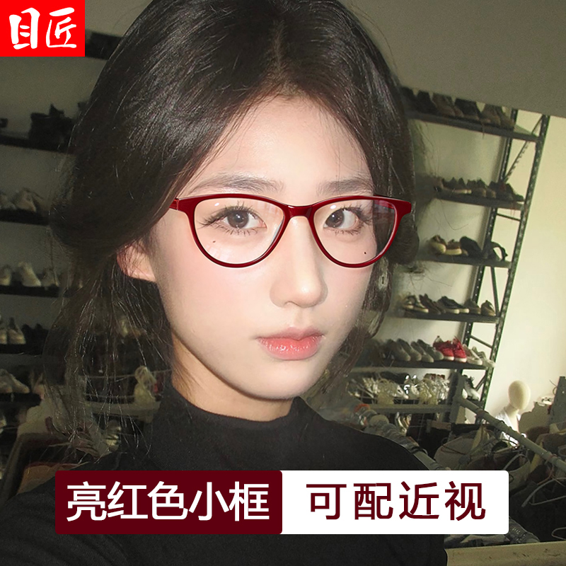 天猫超轻复古红色边框猫眼型近视眼镜框女款可配度数素颜小框红框镜架