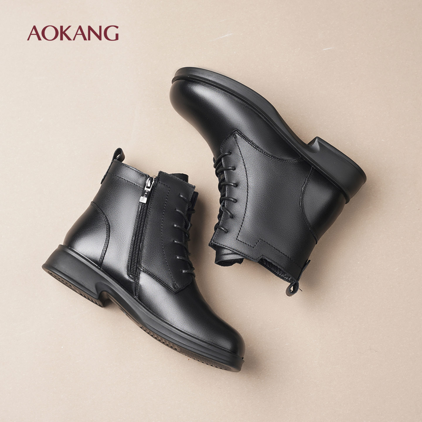 天猫奥康 女鞋秋冬季保暖女士靴子厚底英伦风马丁靴真皮加绒加厚短靴L