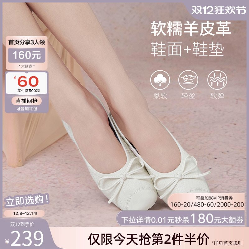 天奥康女鞋 春秋季法式晚晚风单鞋复古蝴蝶结浅口舒适平底鞋
