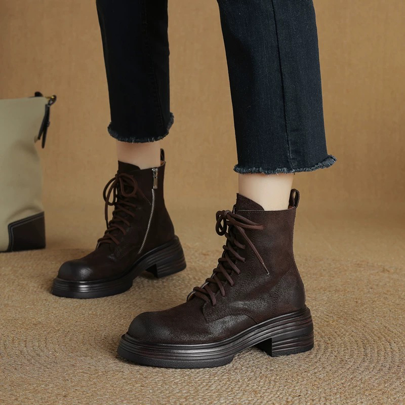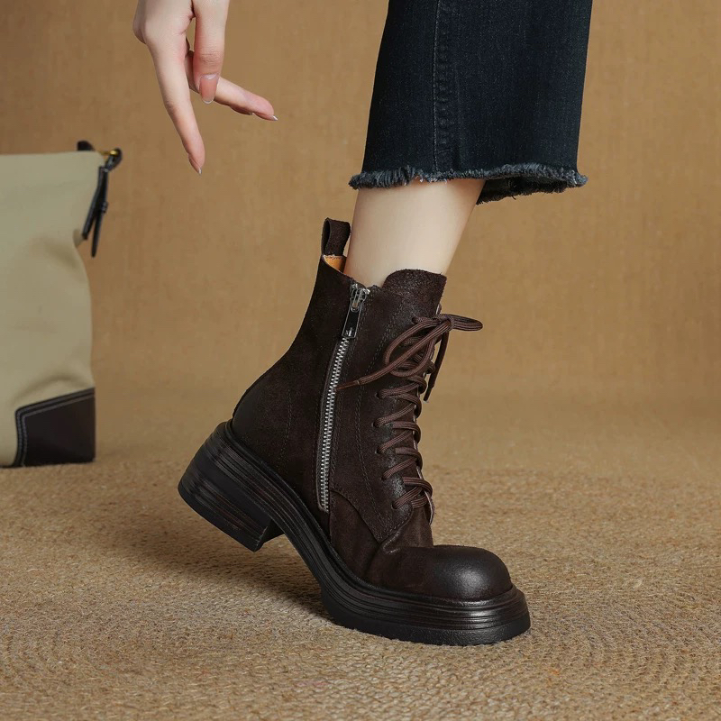 真皮英伦短靴女秋冬新款棕色方头粗跟后拉链简约休闲百搭瘦瘦靴