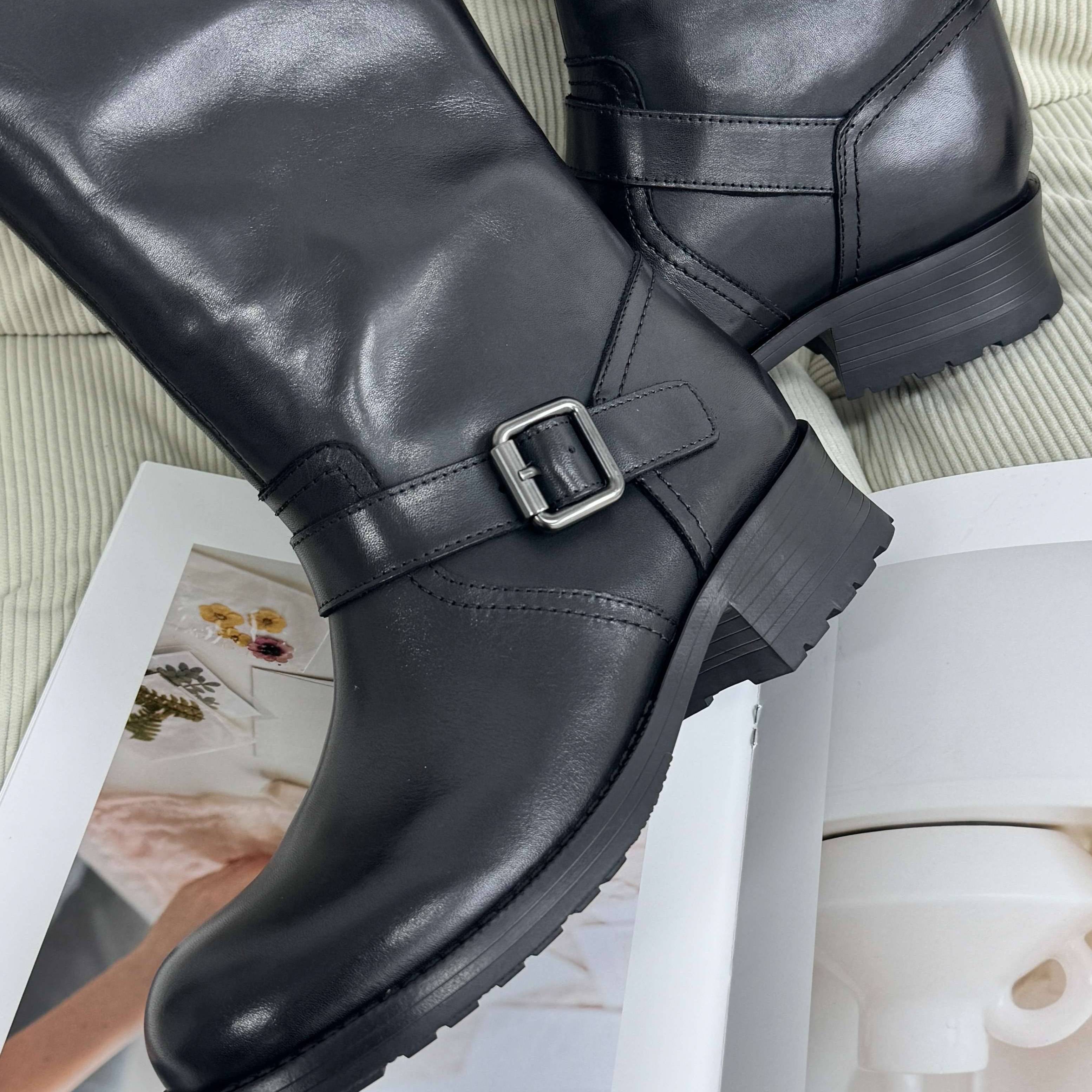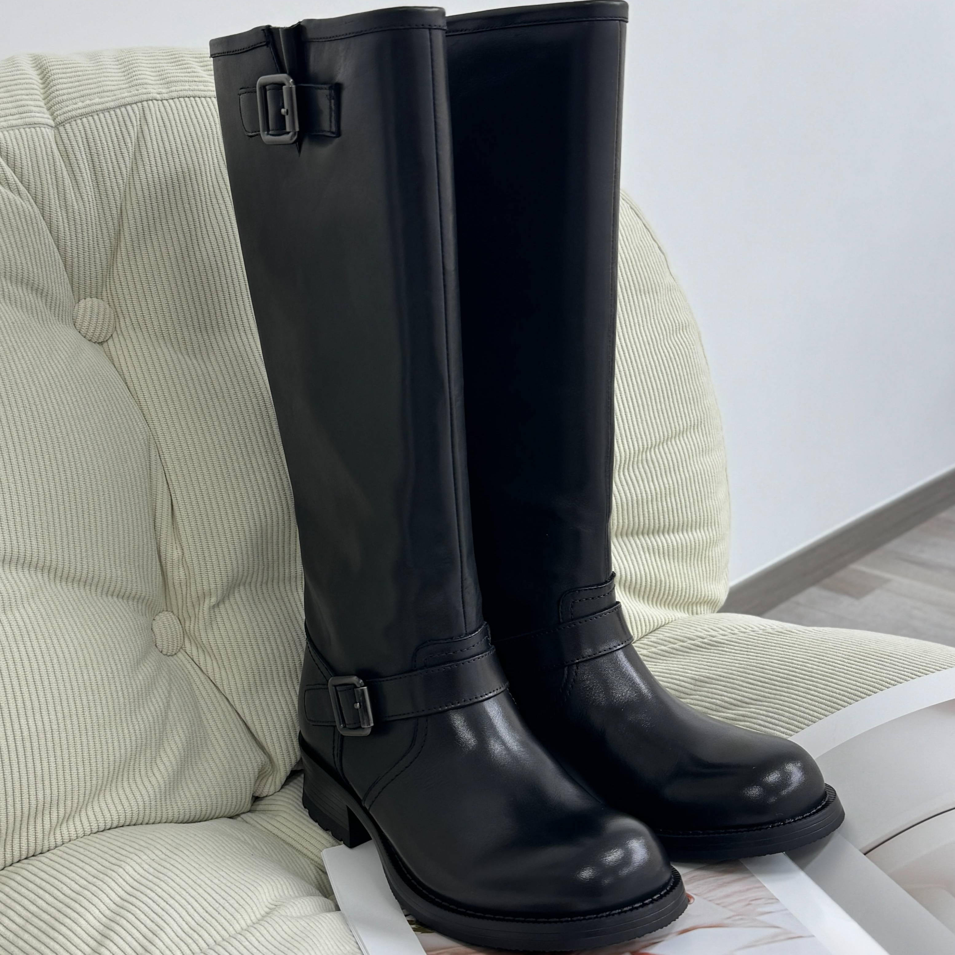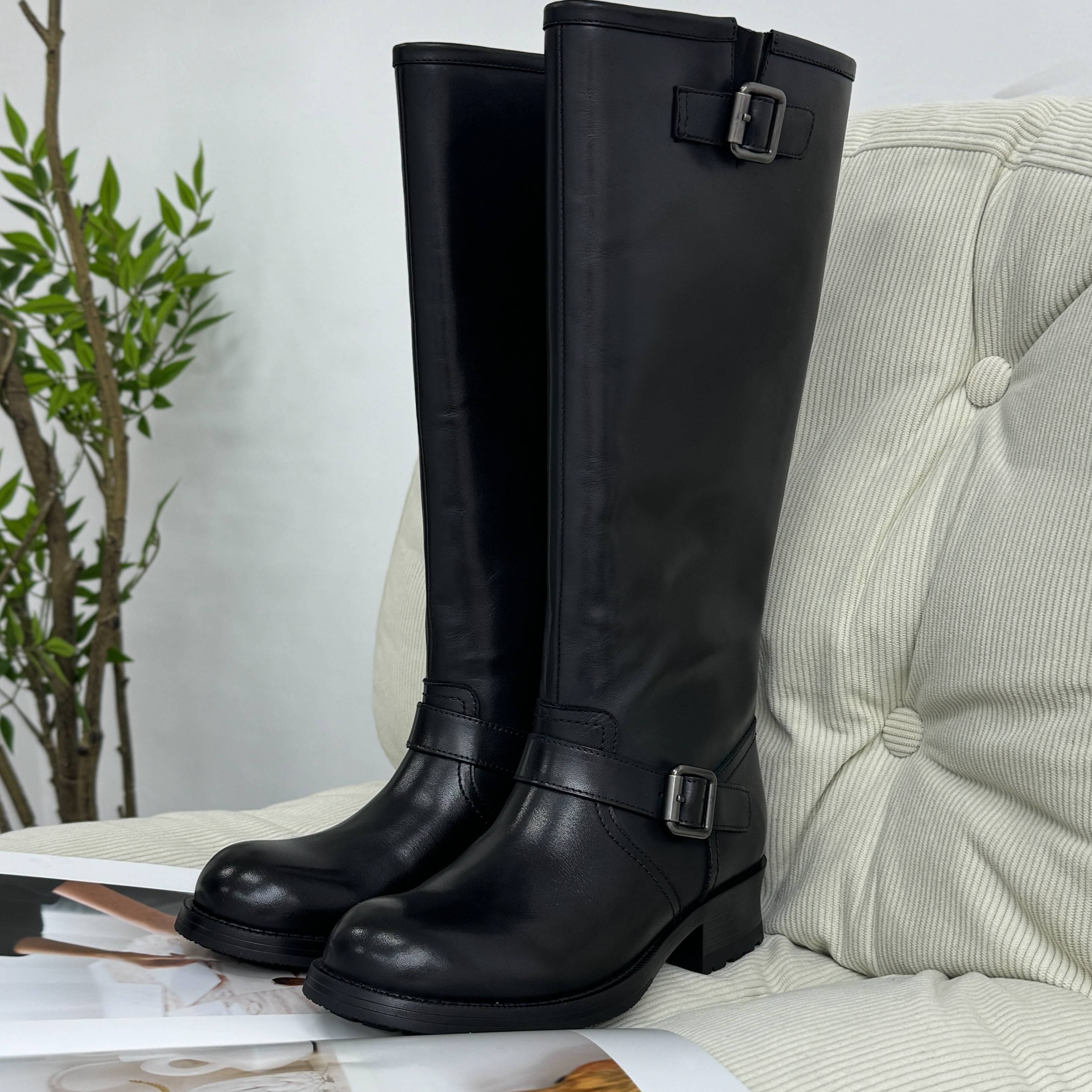 淘宝跟高5CM复古大圆头牛皮骑士靴简约潮流高筒休闲烟筒靴女XC1110-2