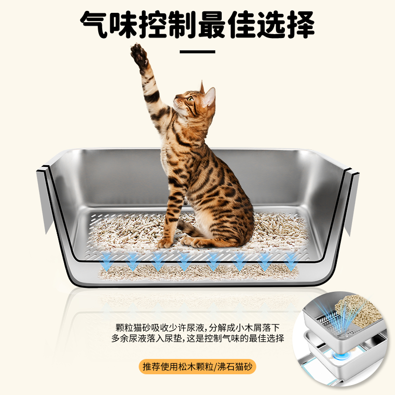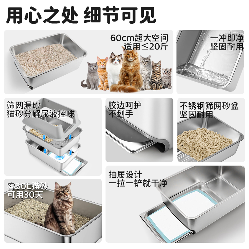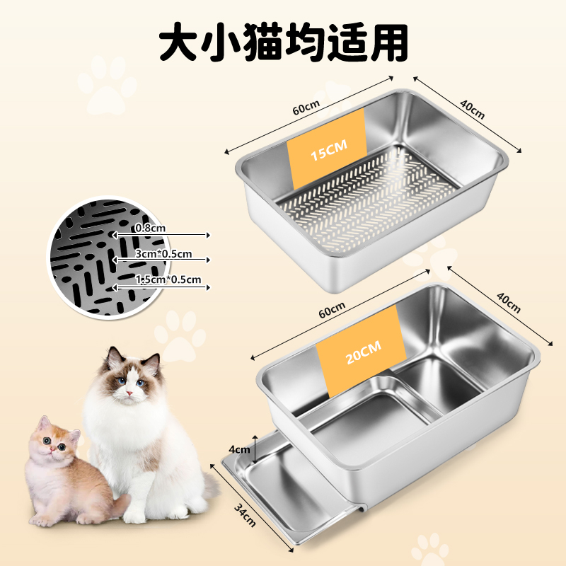 巴兔可不锈钢双层猫砂盆是一款半封闭的猫厕所,采用干湿分离设计,有效避免猫砂外溅,方便清理猫粪和猫尿。该猫砂盆超大号设计,能够满足猫的舒适需求。此外,它还具有抽屉式设计,便于清洁和清理猫粪和猫砂,节省主人的时间和精力。采用优质不锈钢材质,坚固耐用,使用寿命长。这款猫砂盆既美观又实用,是养猫家庭不可或缺的一款产品。无论是大小猫咪都可以使用,让您的猫咪享受健康舒适的生活环境。