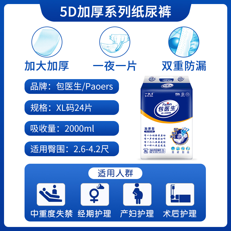 包医生夜用加厚成人纸尿裤是一款专为成人设计的护理用品,适用于夜间使用。该纸尿裤采用加厚设计,更加舒适柔软,能够有效吸收尿液,保持肌肤干爽舒适。该商品适用于男女成人使用,尤其适合老年人使用。这款成人尿垫易于使用和更换,方便快捷,可帮助减少夜间起床次数,提高睡眠质量。每盒包含XL码的成人纸尿裤共24片,适合不同需求的人群使用。这款包医生夜用加厚成人纸尿裤是您理想的护理选择,能够带给您一个更为舒适的睡眠体验。