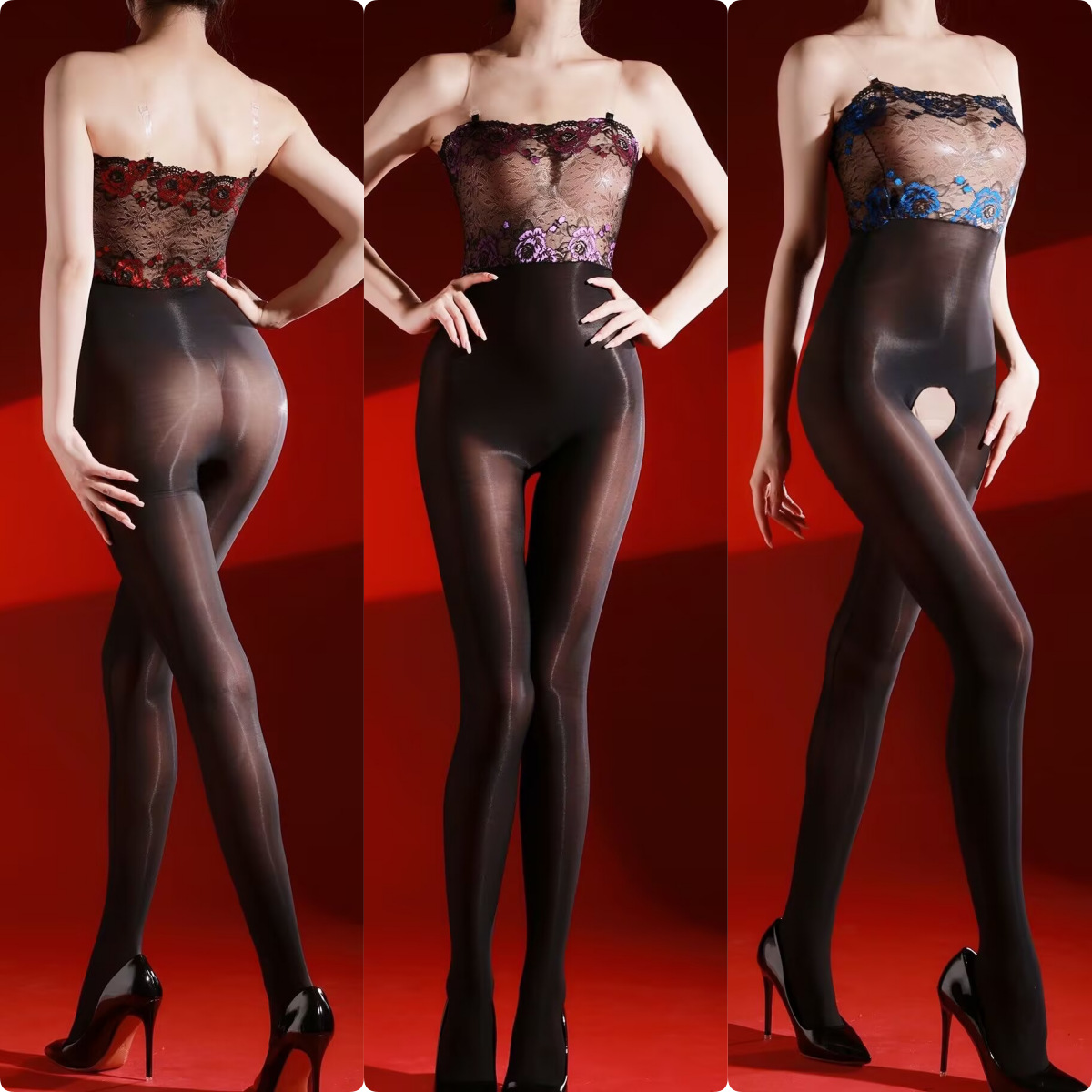 淘媚色撩人!性感内衣吊带蕾丝开裆抹胸丝滑油光油亮连身丝袜