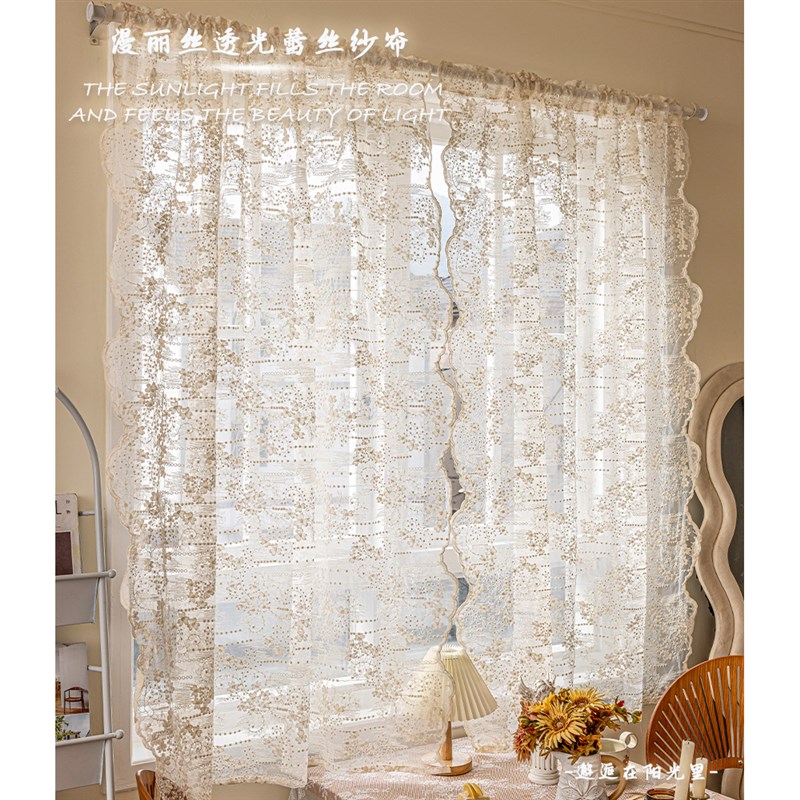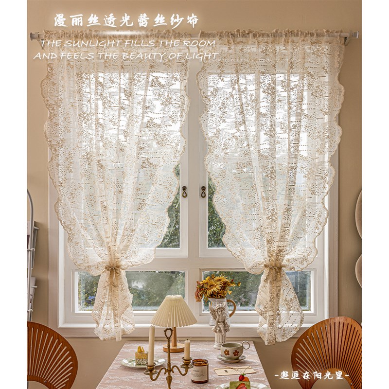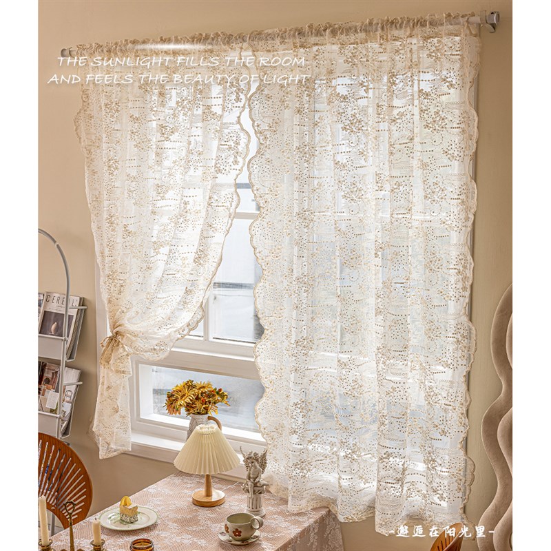 淘新款直销田园乡村蕾丝棉线格子纯米色镂空窗帘落地隔阳帘装饰帘背