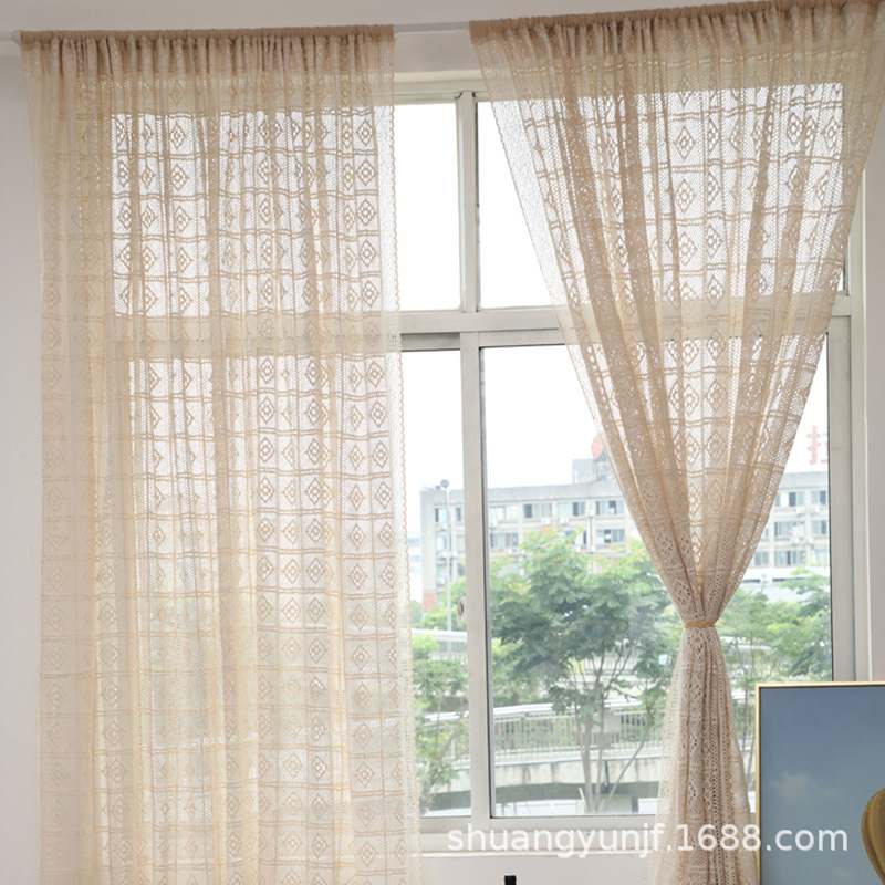 淘宝新款直销田园乡村蕾丝棉线格子纯米色镂空窗帘落地隔阳帘装饰帘背