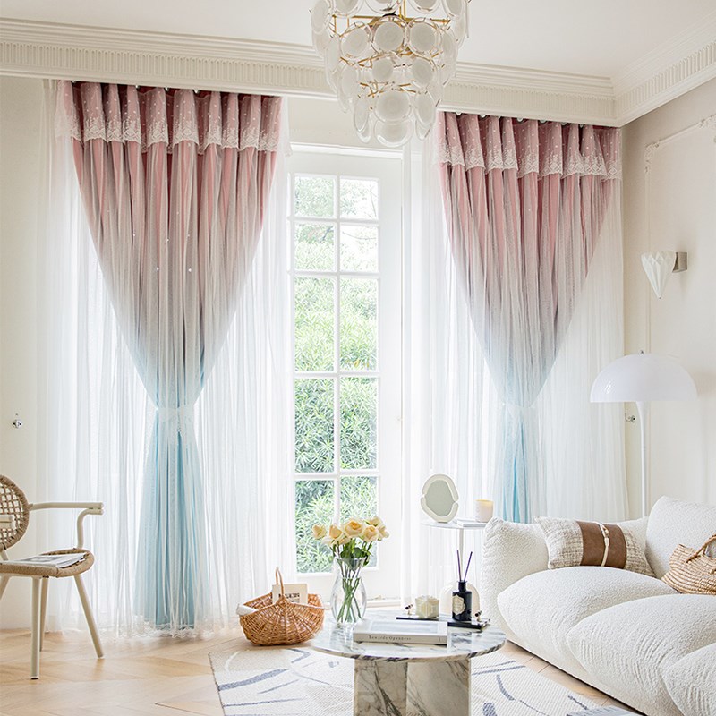 淘宝公主风窗帘c免打孔安装双层带纱伸缩杆全套女孩房间布纱一体遮光