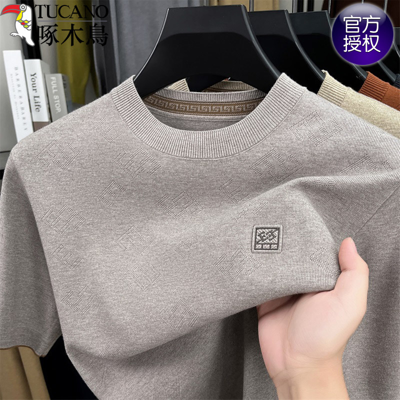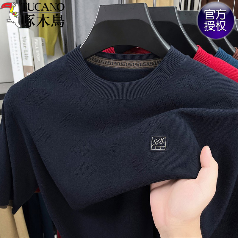 淘宝啄木鸟2025秋冬季男士短袖t恤商务休闲纯色针织半袖宽松打底衫男