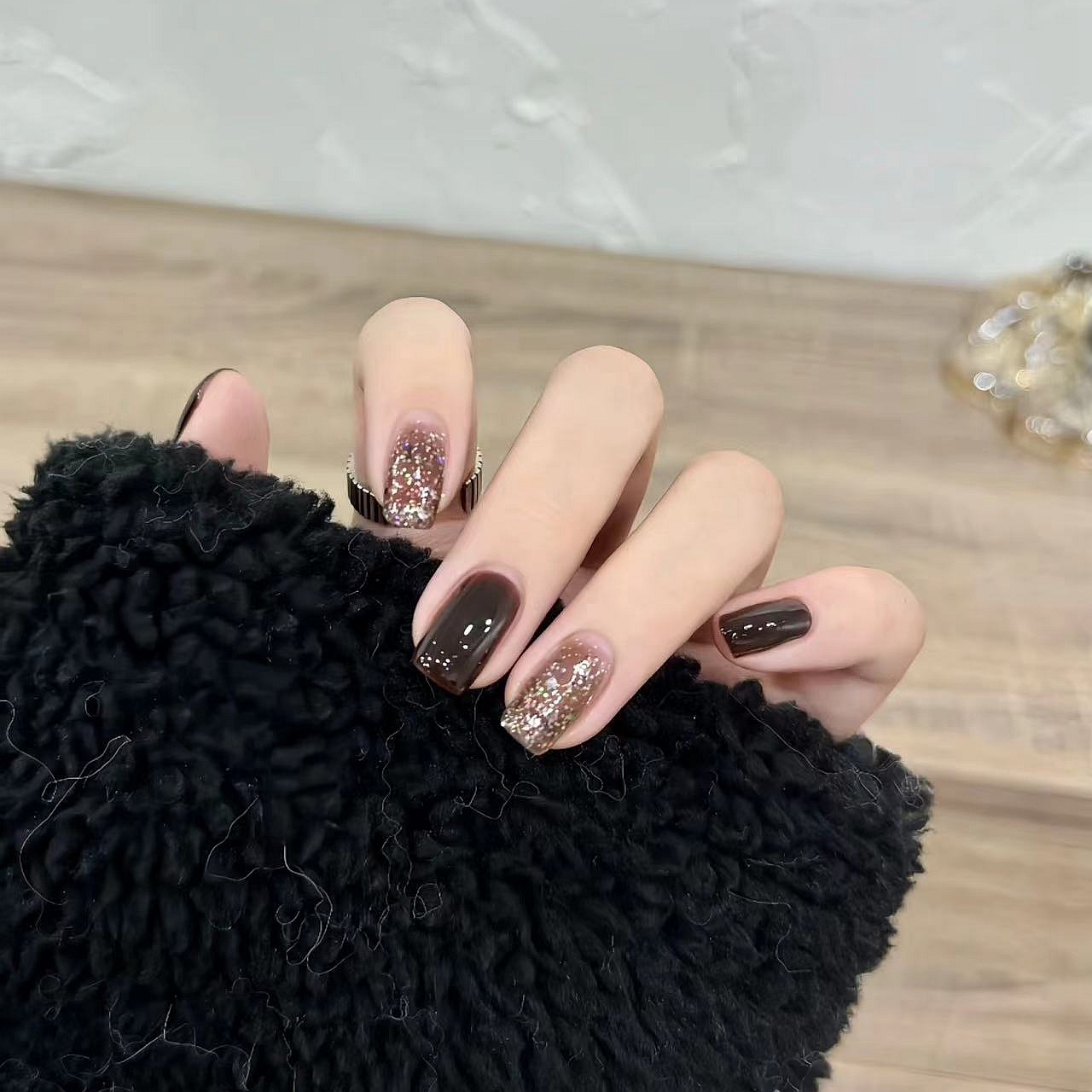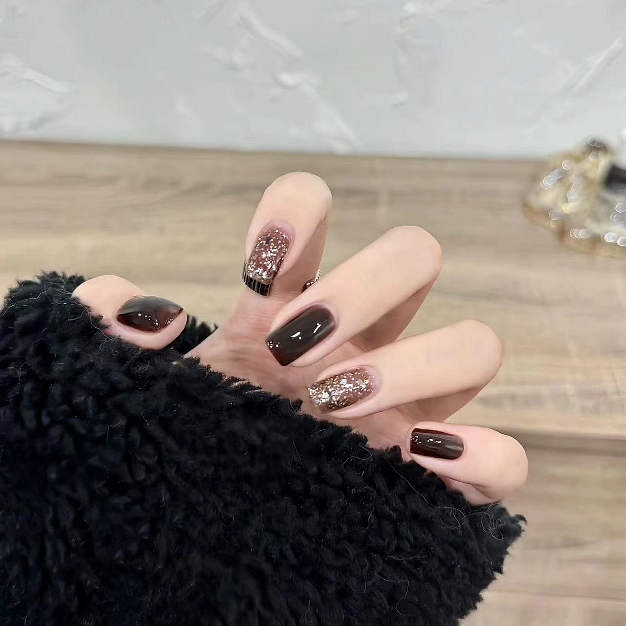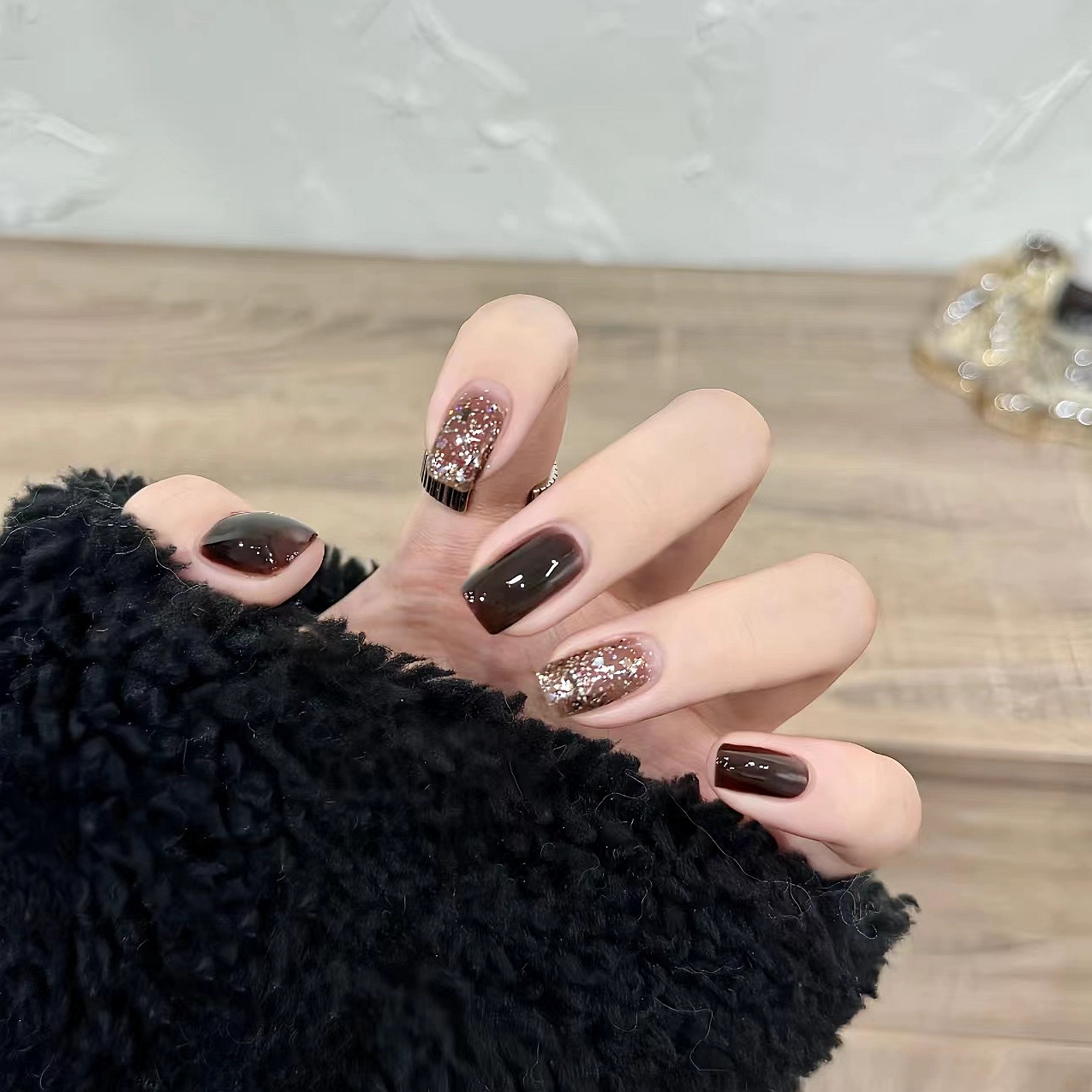 淘宝NANA穿戴甲清冷感简约爆闪秋冬新款琥珀茶棕碎钻手工定制美甲贴片