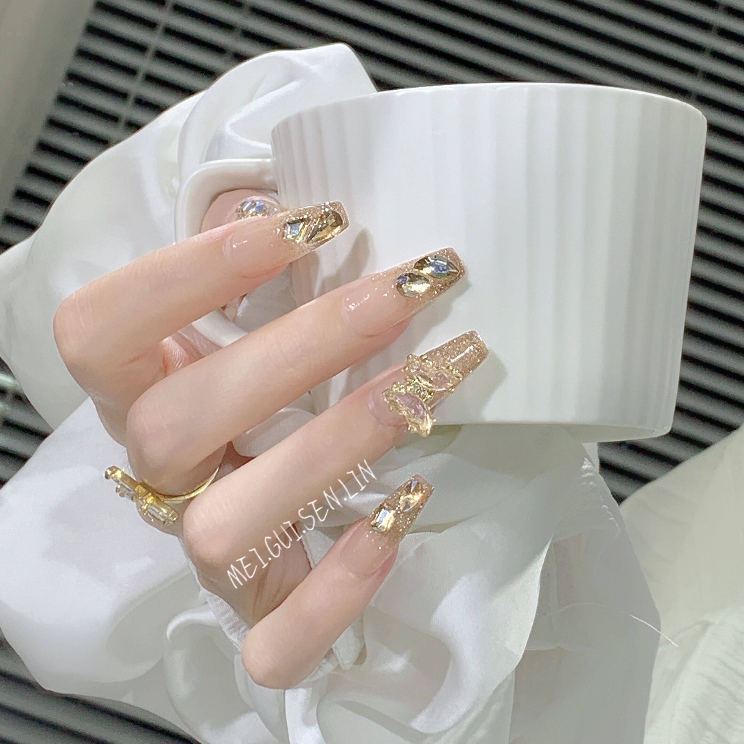 淘手工美甲穿戴甲ins法式鎏光金焰冰透猫眼细闪带彩钻高级感假指甲