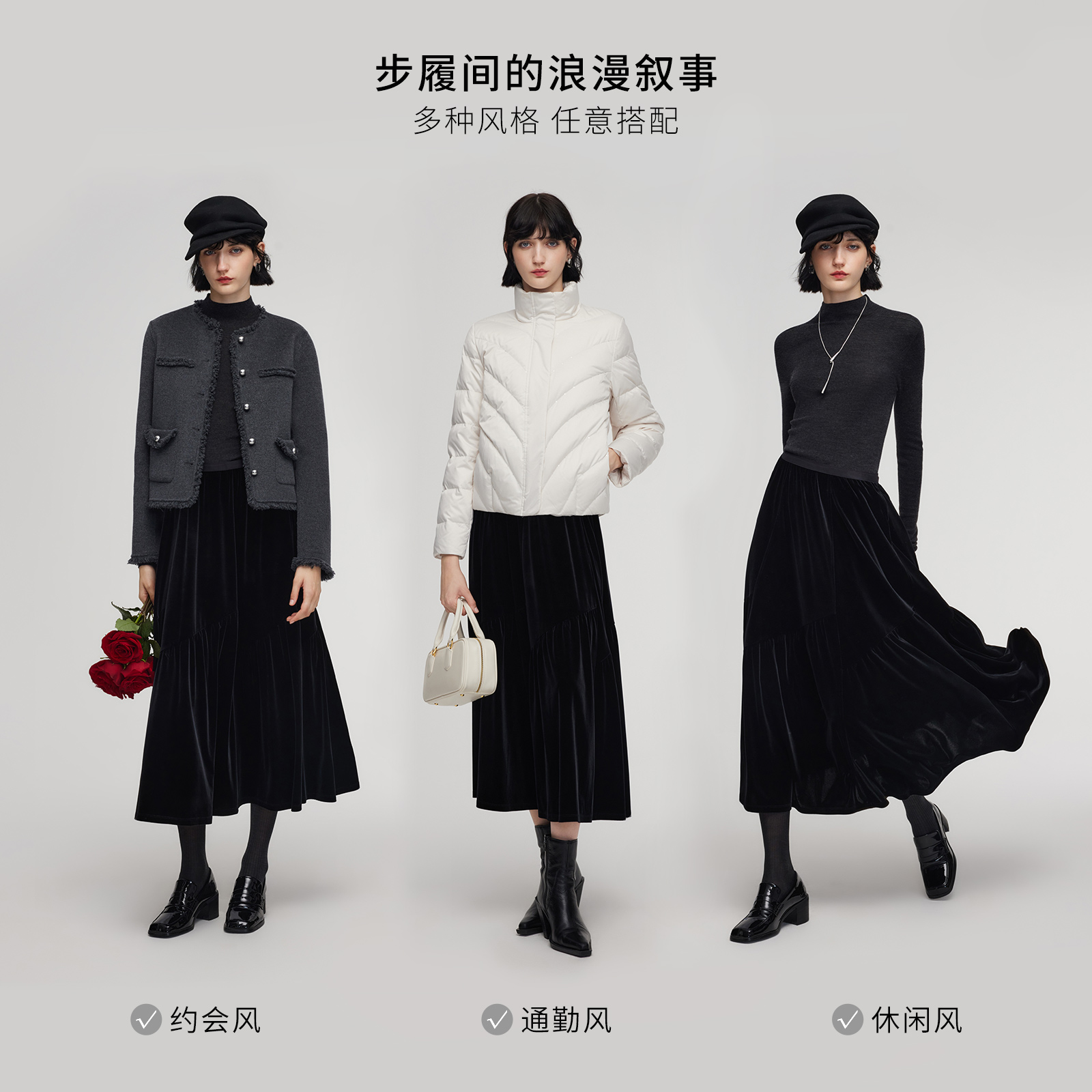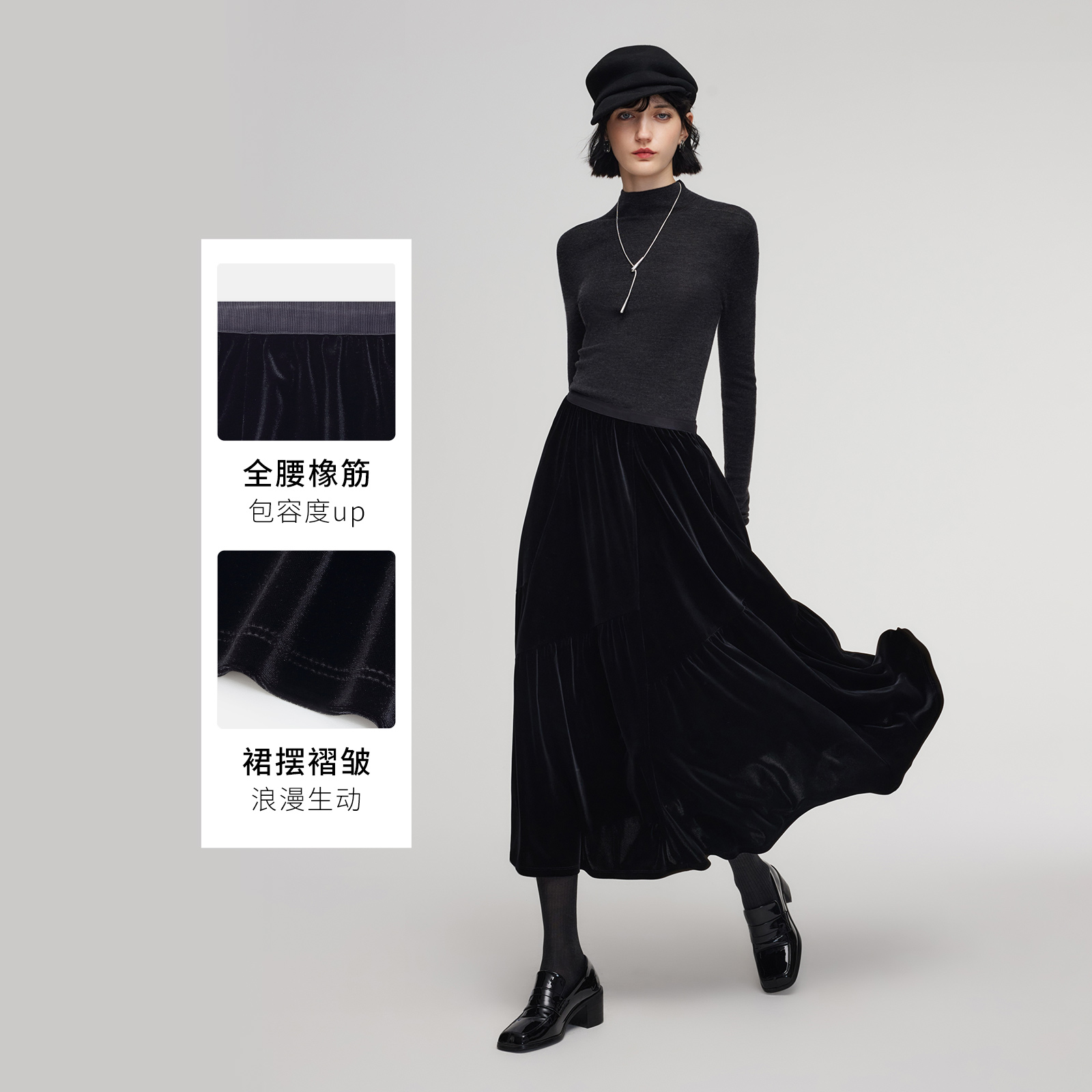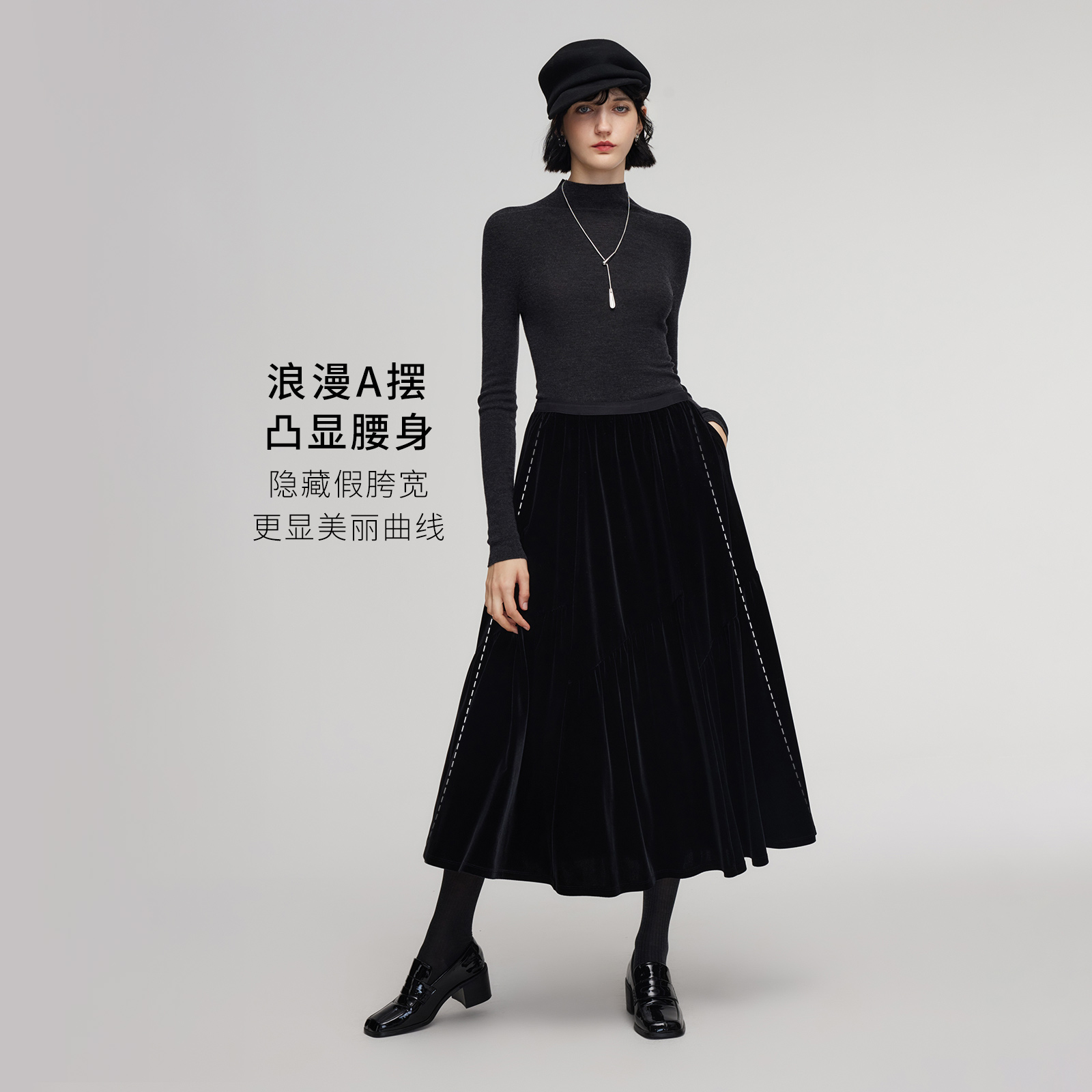 天猫歌莉娅黑色丝绒半身裙女2025新款冬季穿搭高腰伞摆长裙1E3R2B23D