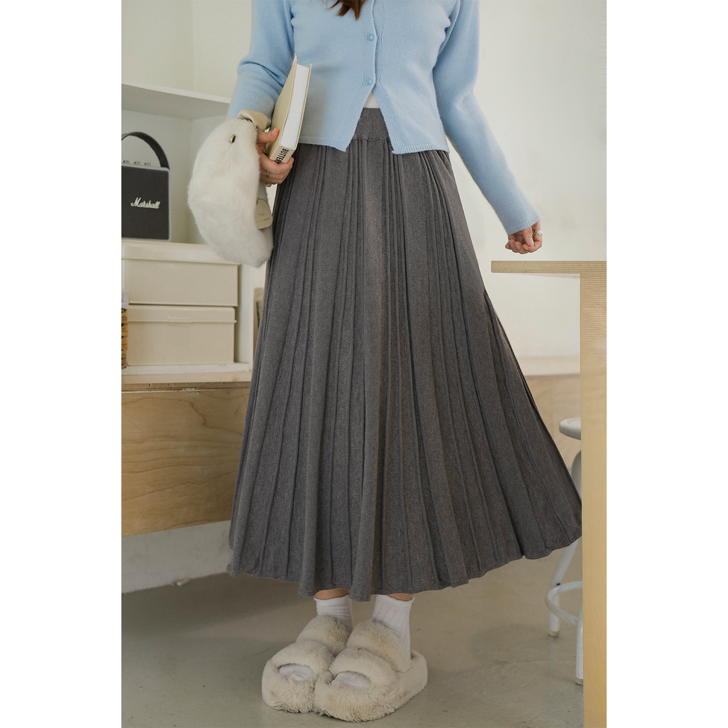 Echoone suger 糖霜 麂皮压褶半身裙女气质优雅高腰显瘦中长裙子
