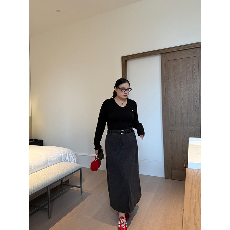 巨好看的大码黑色毛呢款半身裙女胖妹妹高腰mm显瘦后开叉直筒长裙