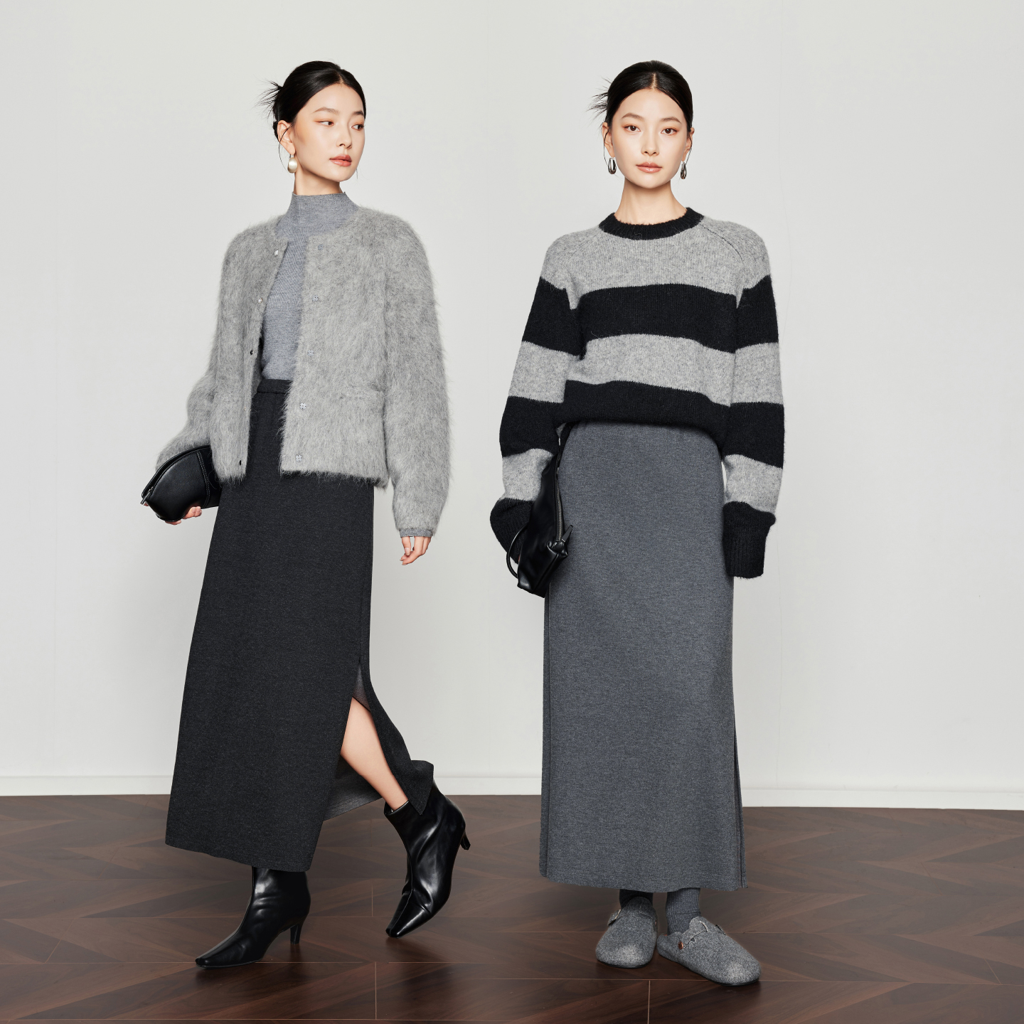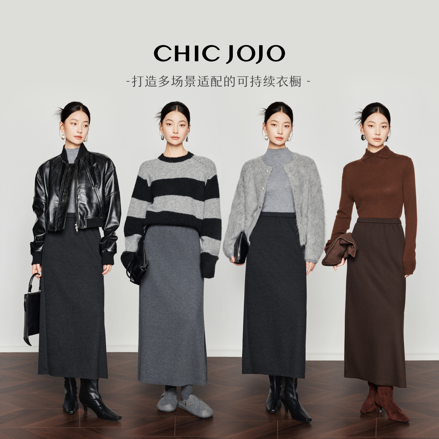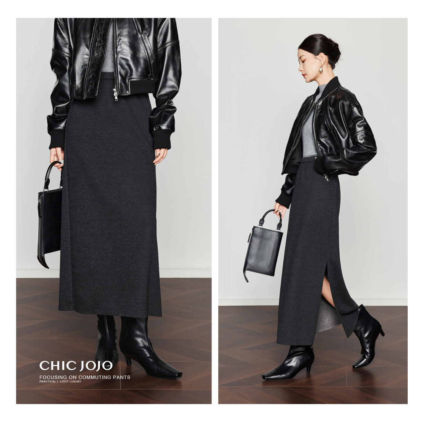 天猫【云舒织影】CHICJOJO灰色直筒半身裙女25冬新款松紧开叉针织半裙
