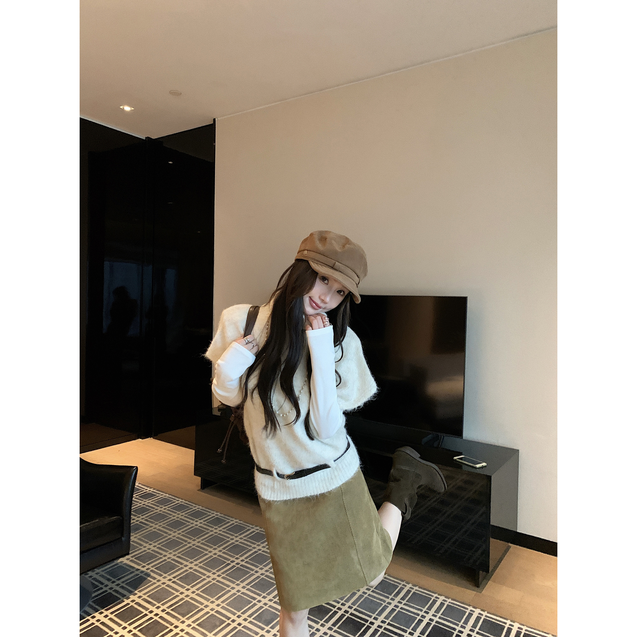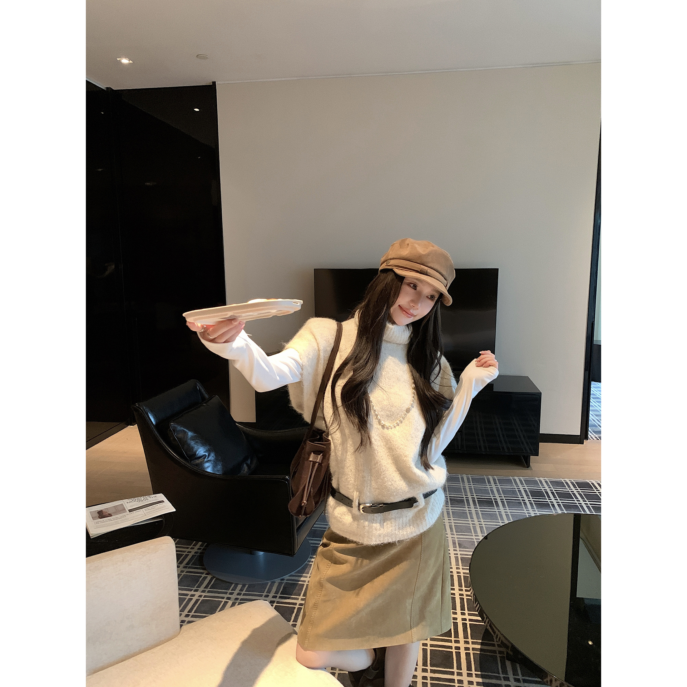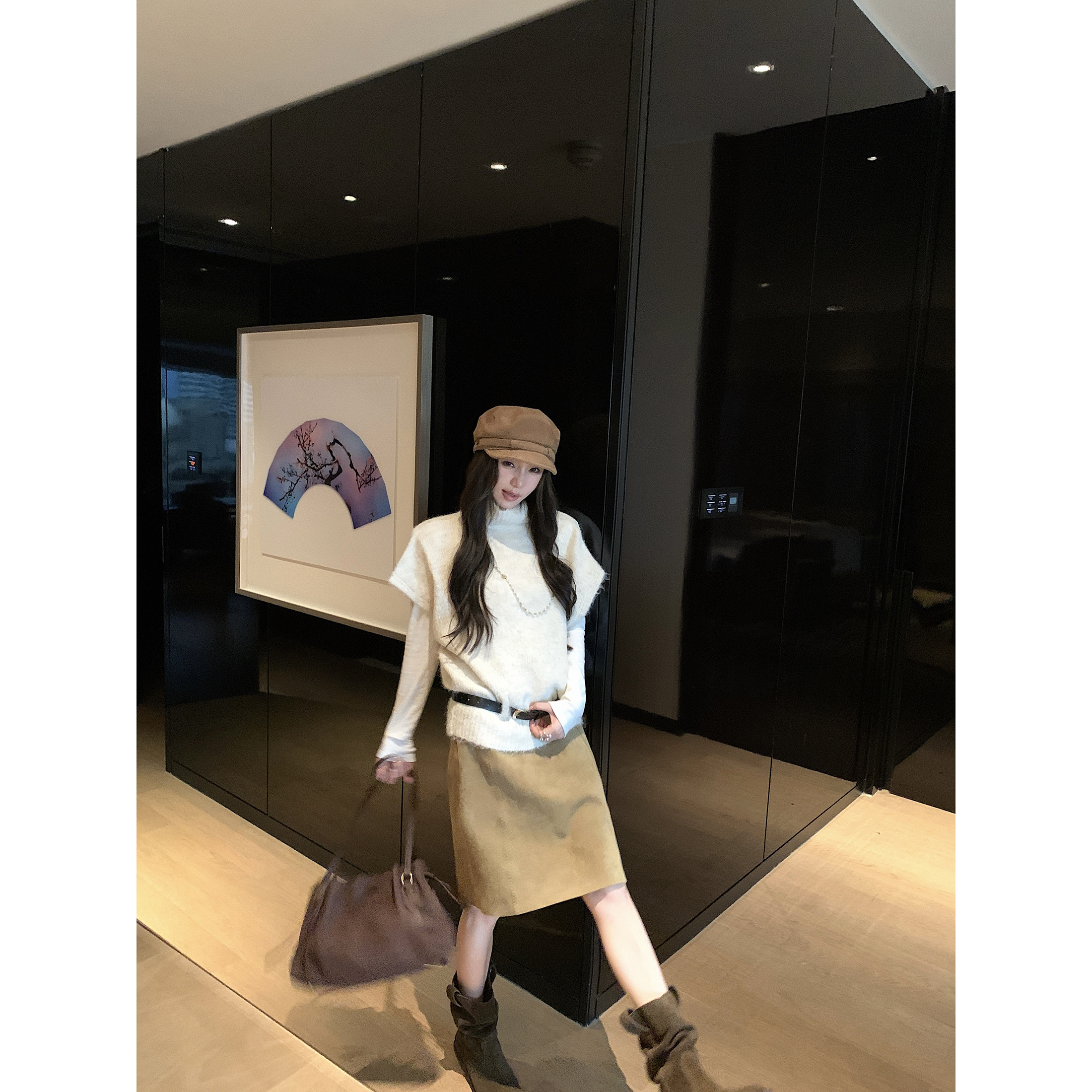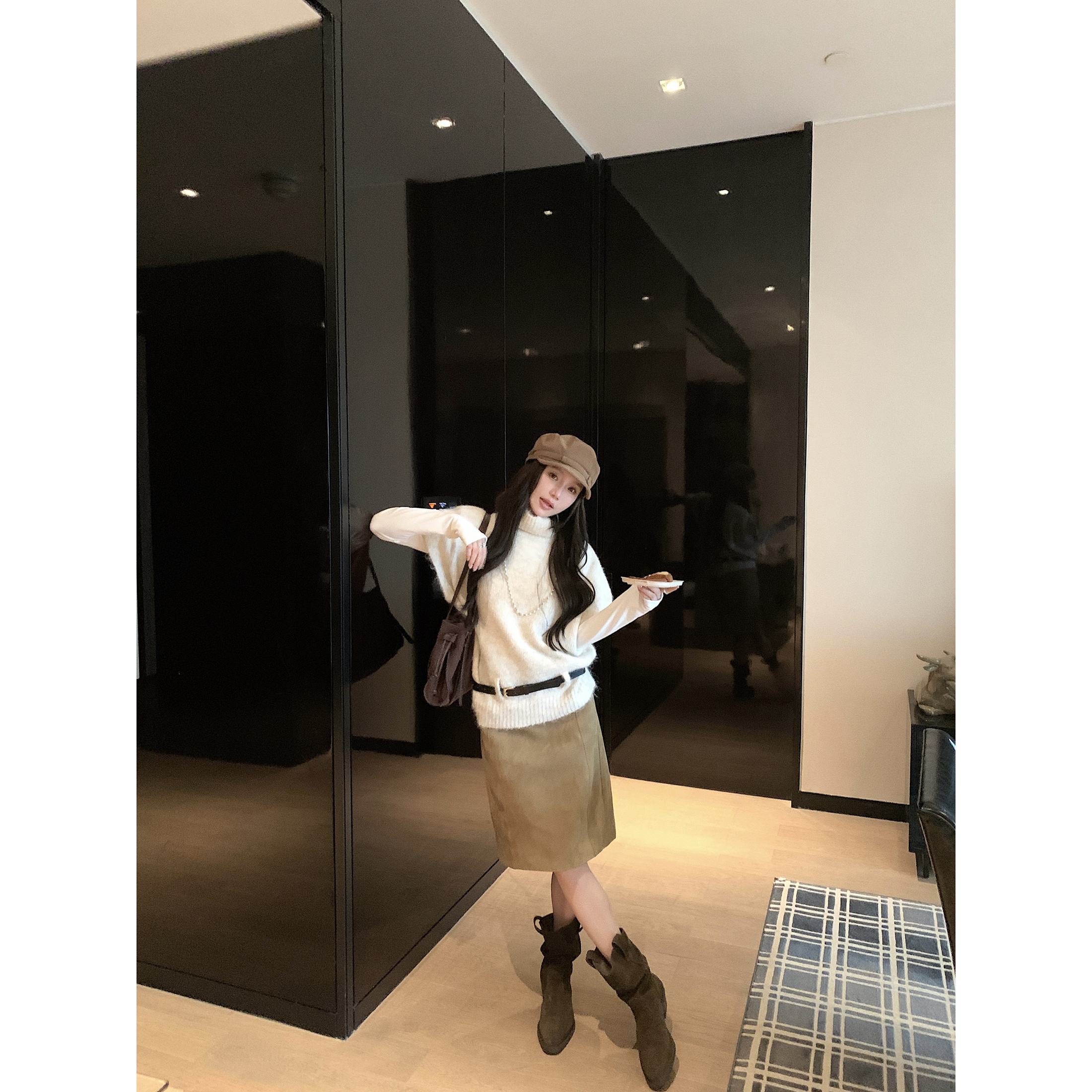 淘宝卡其色麂皮腰带直筒A字低腰半身裙女秋季复古宽松显瘦百搭中长裙