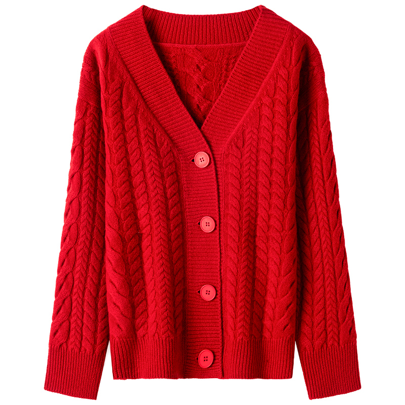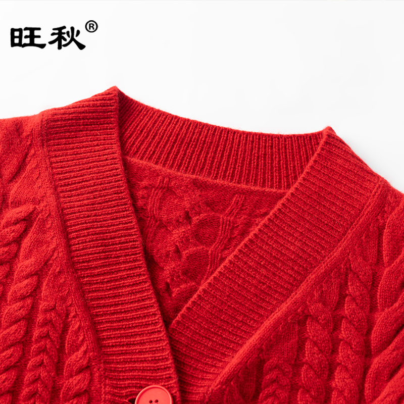 淘宝旺秋冬新款V领100%纯羊毛开衫女针织麻花羊绒外套长袖咖色毛衣女