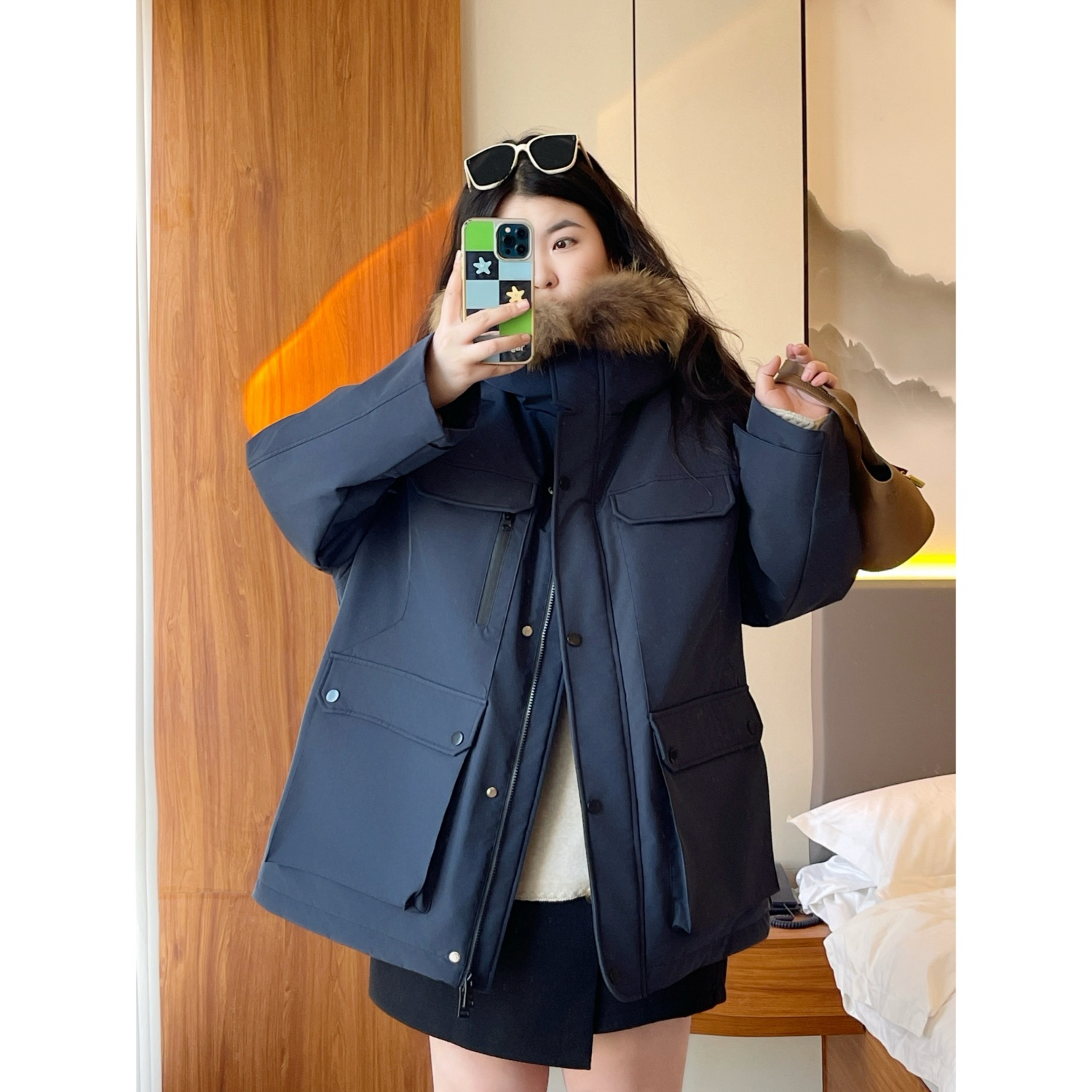 淘宝梵朵大码女装15241冬季韩版设计毛领羽绒服宽松工装加厚派克外套