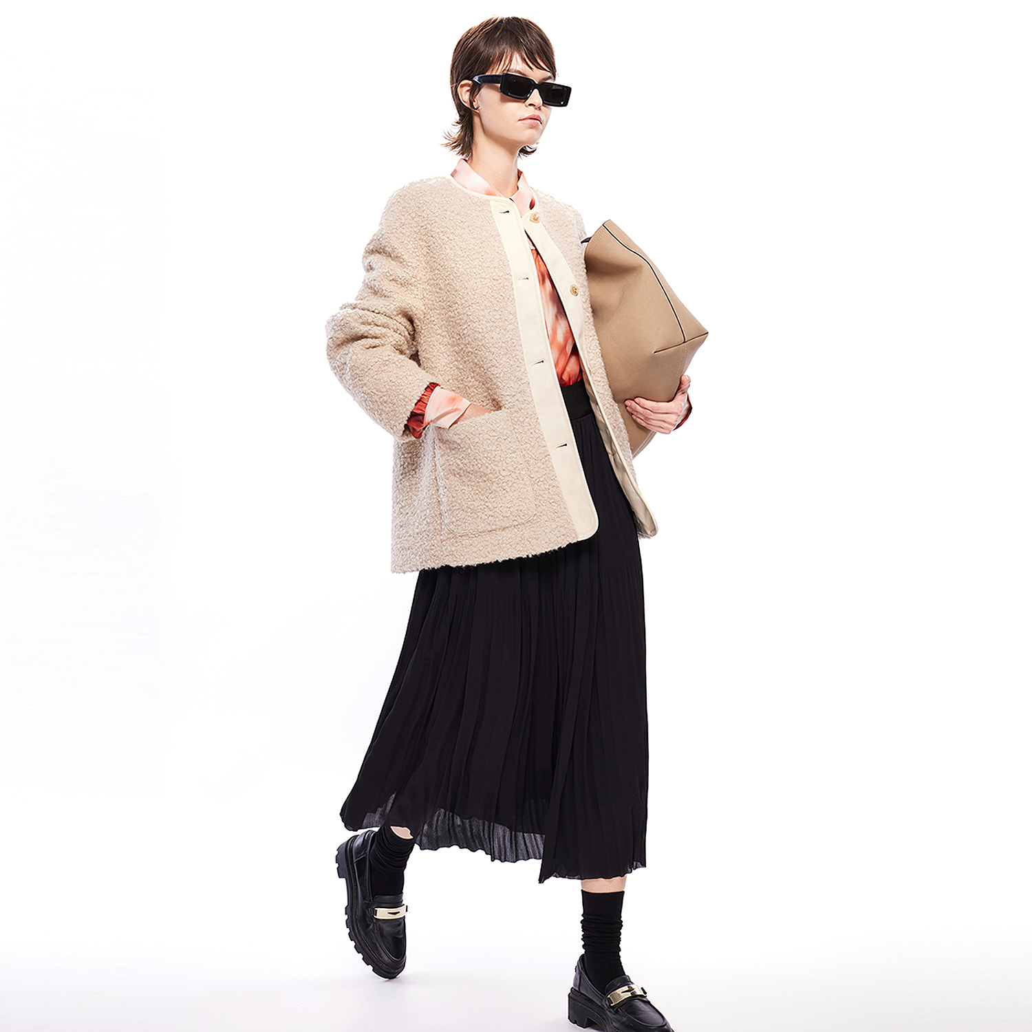 天猫DKNY唐可娜儿25秋季女装纯色羊毛仿羊羔绒圆领仿皮拼接夹克外套
