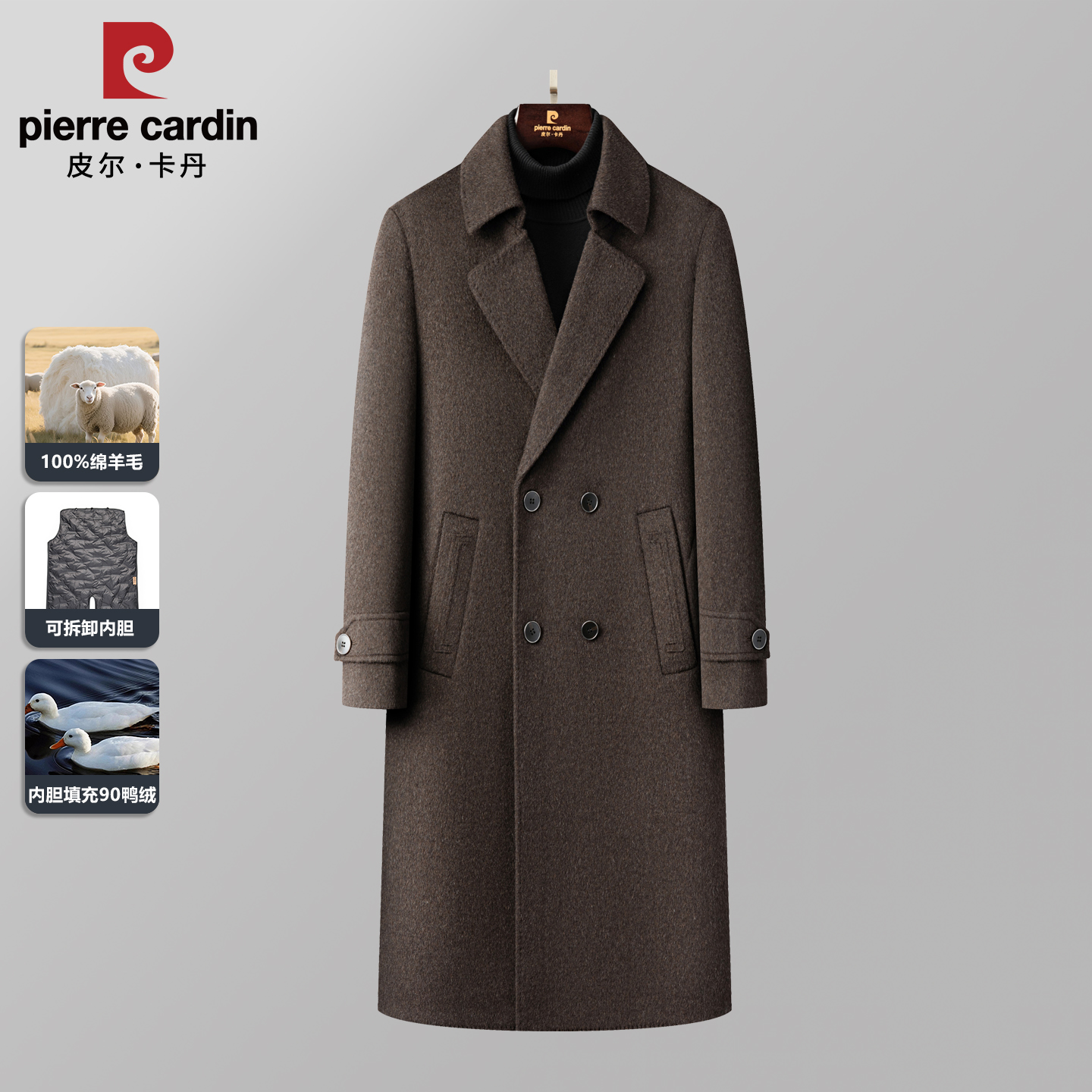 皮尔卡丹羊毛呢大衣男中长款西装领双排扣双面呢冬季加厚风衣外套