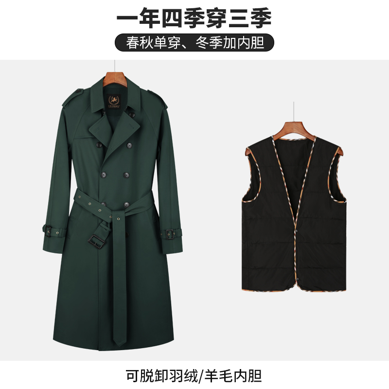 天猫蓝色超长款风衣男双排扣插肩袖英伦潮流男士加厚保暖羽绒内胆外套