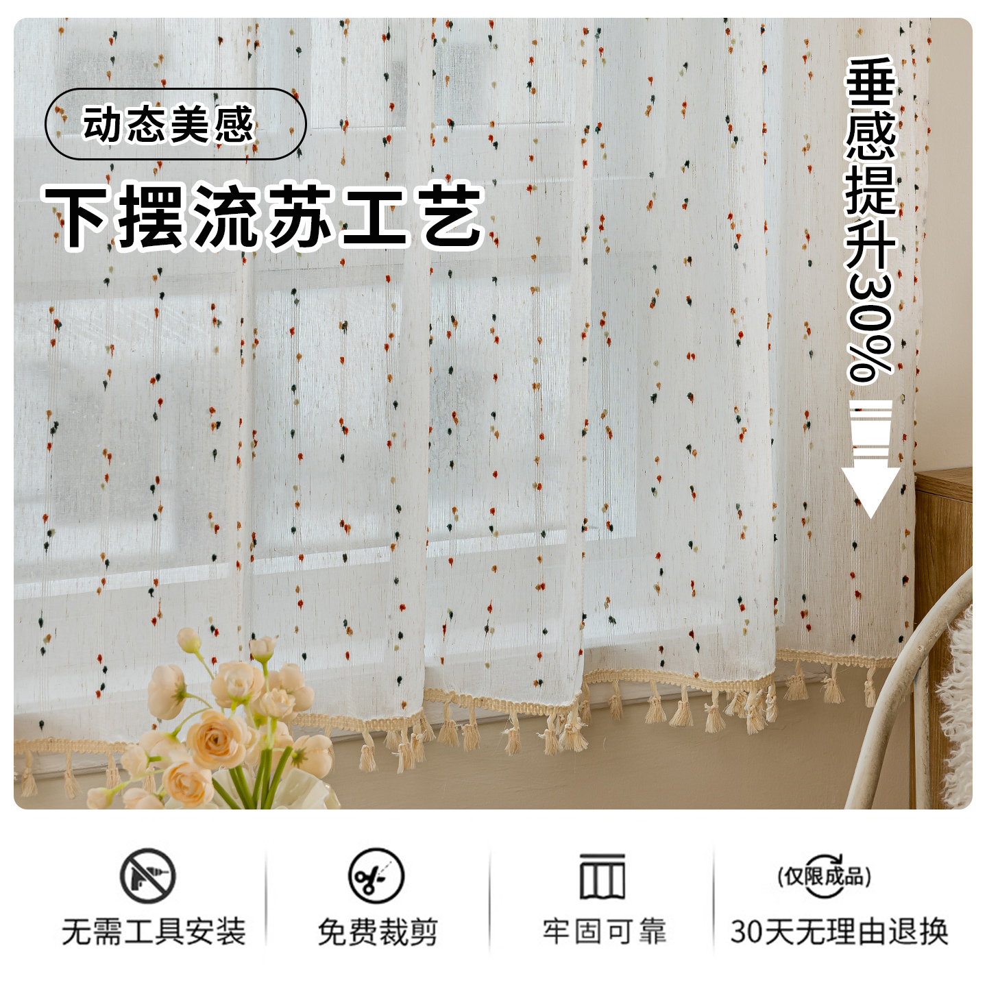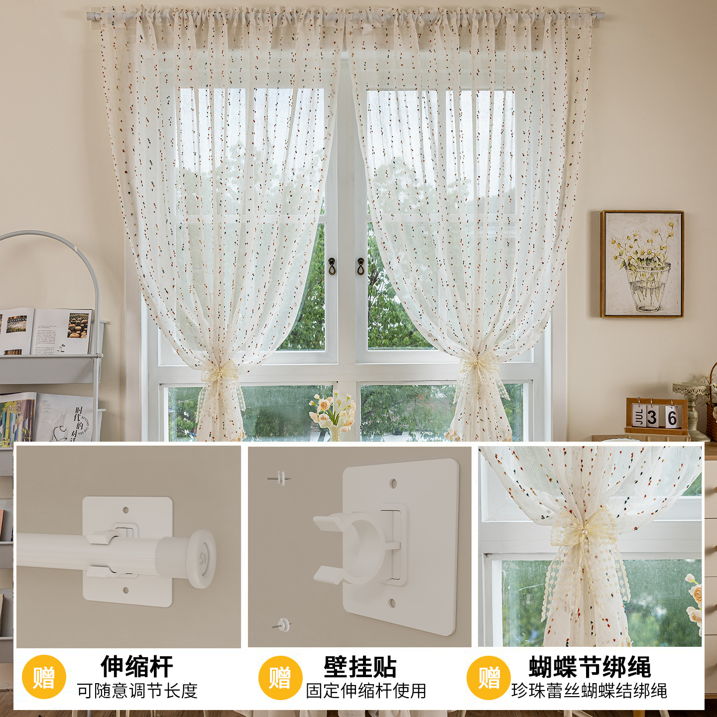 天猫彩虹糖豆亚麻纱帘免打孔安装卧室儿童房飘窗法式窗帘小窗户遮挡帘
