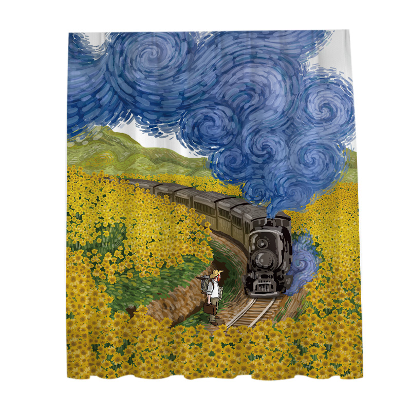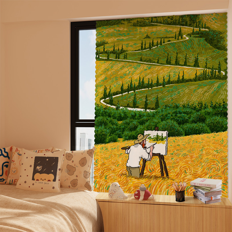 淘宝飘窗窗帘成品免打孔卧室少女窗帘魔术贴窗帘自粘式遮光油彩梵高