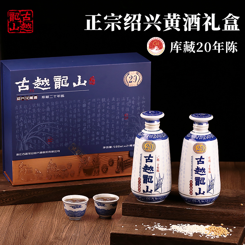 天猫古越龙山绍兴黄酒木盒库藏二十年花雕酒500ml*2瓶礼盒装