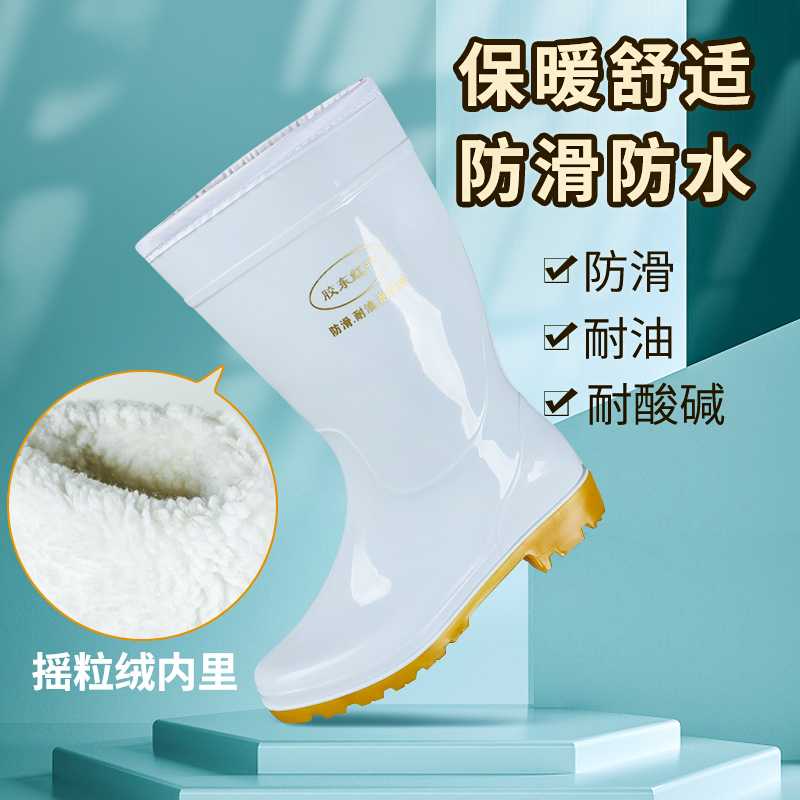 淘白色高筒冬加绒棉雨鞋食品劳保水鞋男防油防滑工地加厚保暖雨靴