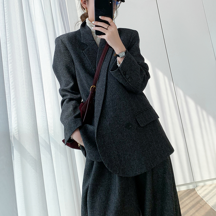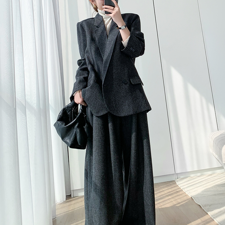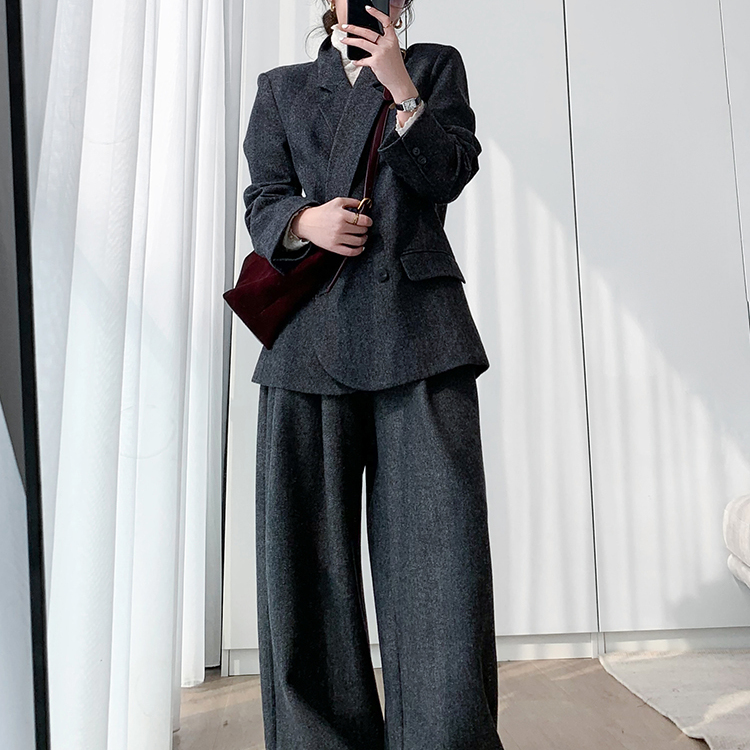 淘宝得体风毛呢西装女深灰色宽松阔腿裤两件套老钱风职场外套