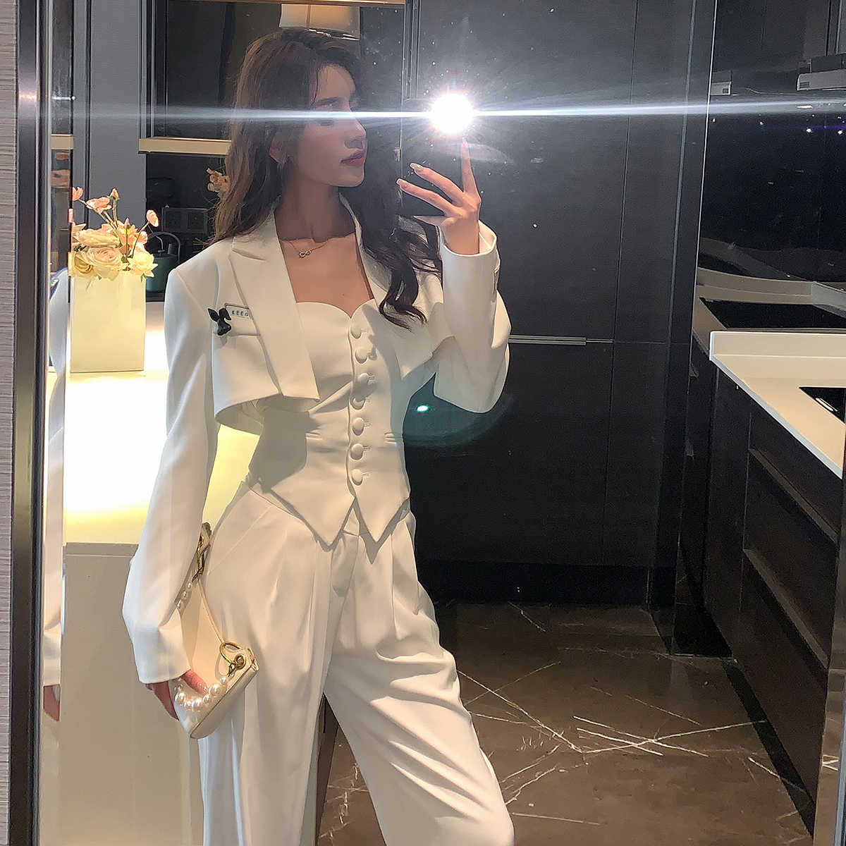 淘宝高级感垫肩短款西服外套女小众设计感白色字母潮牌小西装上衣2025