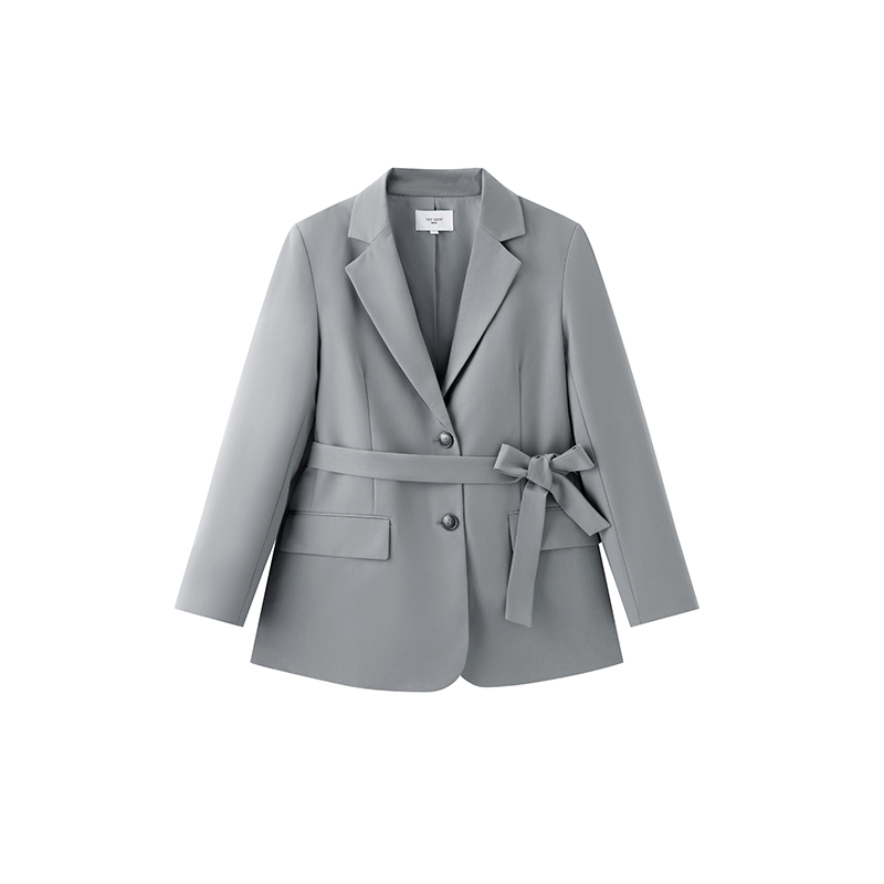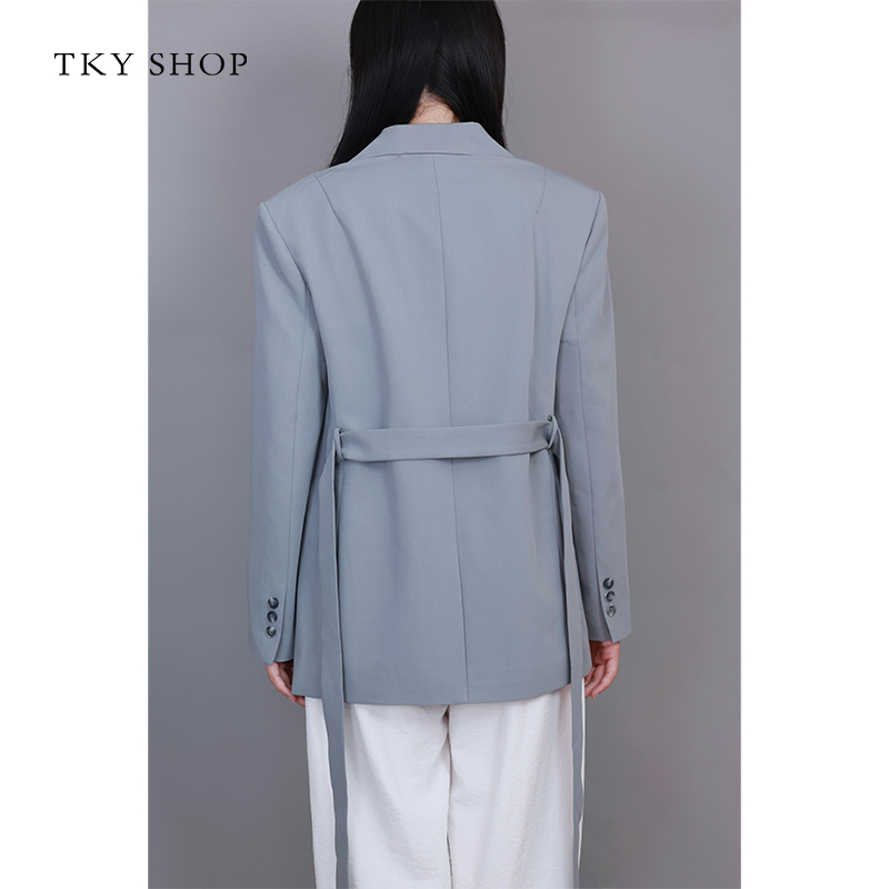 天猫TKY SHOP烟灰色短款西装外套女春夏新款时尚便西设计感收腰系带