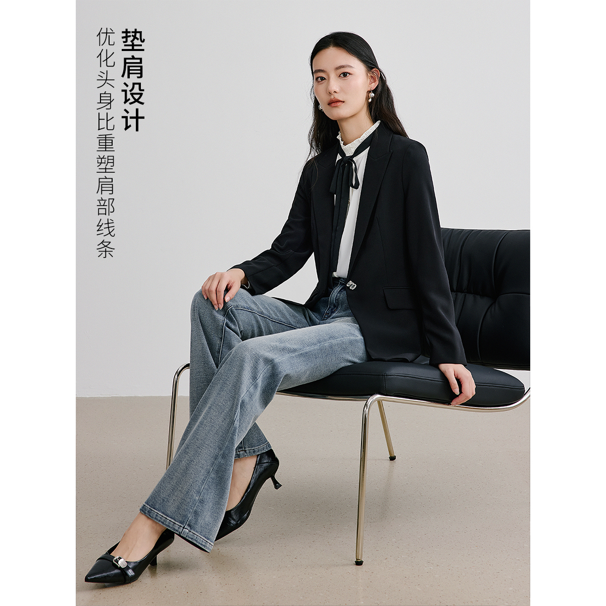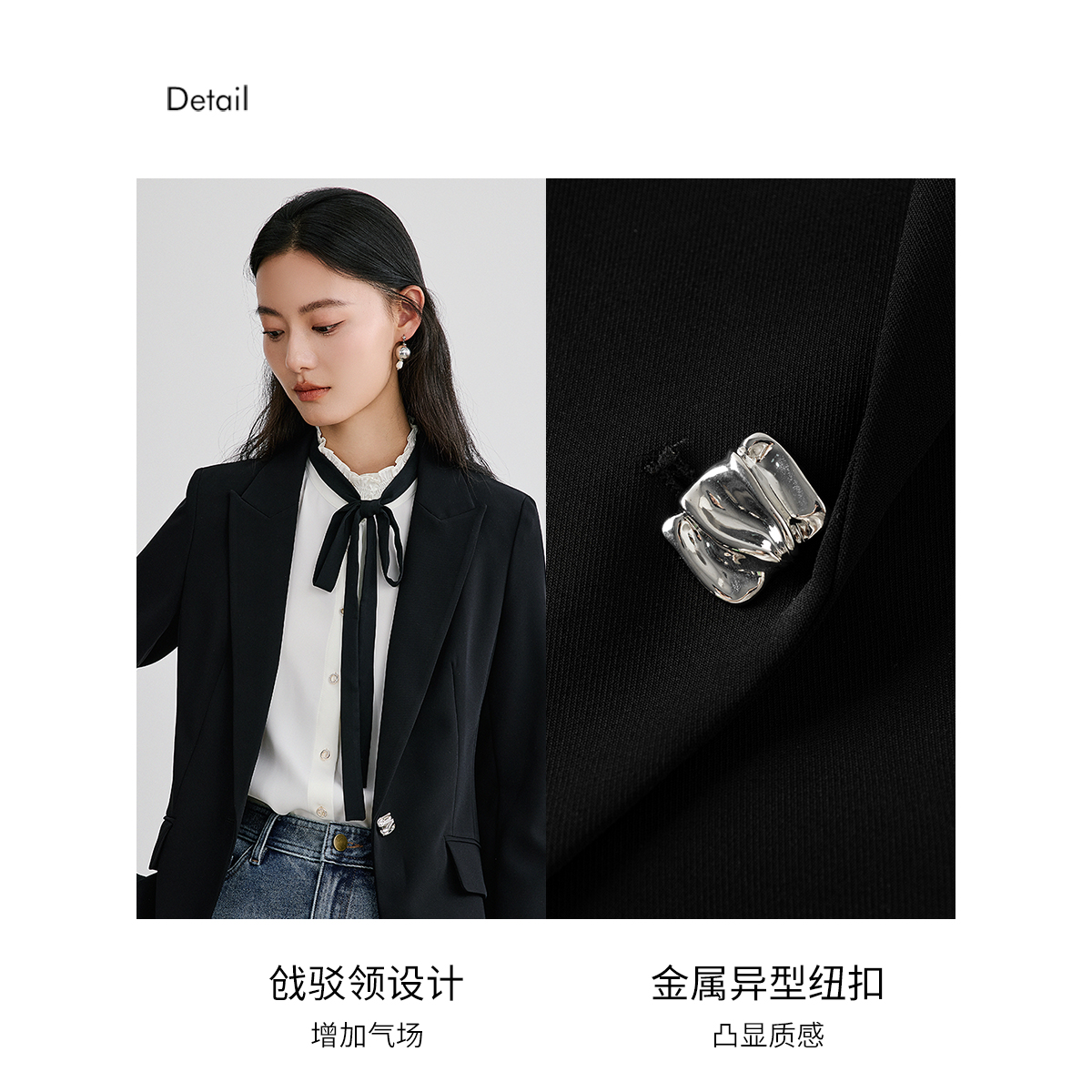 【盈动绽放】珂莱蒂尔2025春季新款黑色醋酸修身单排扣西装外套女