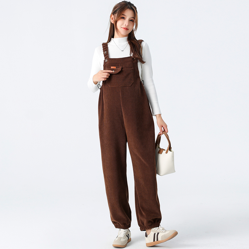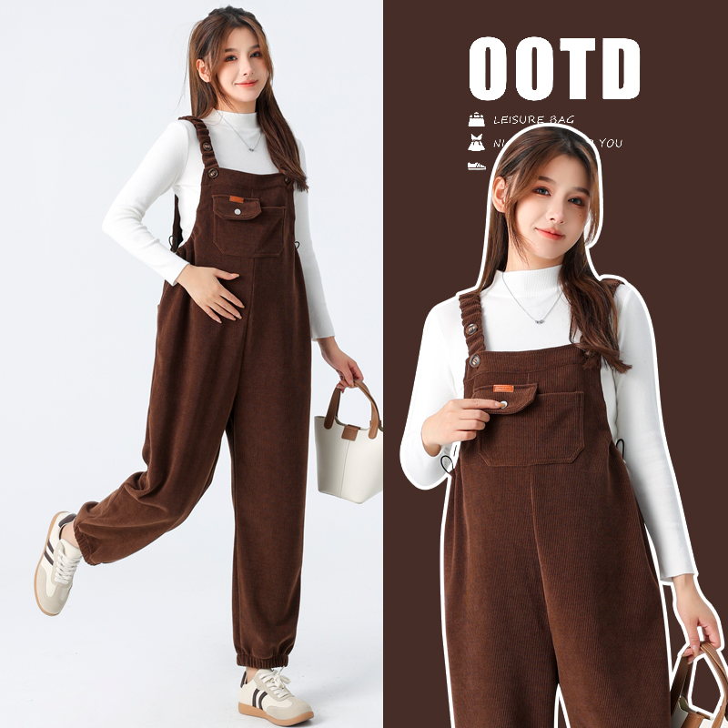孕妇卡其色套装春秋冬2025新款孕妈遮肚加绒加厚温柔背带裤两件套