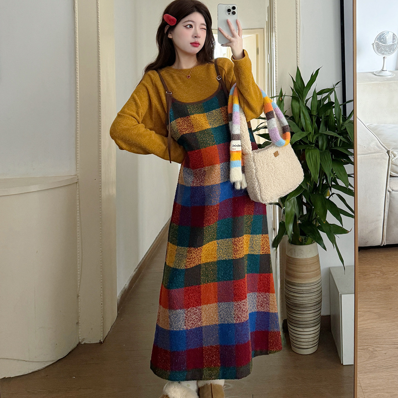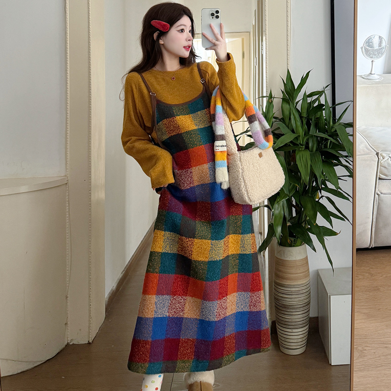 孕妇连衣裙黄色套装秋冬2025新款时尚甜美不显怀宽松背带裙两件套