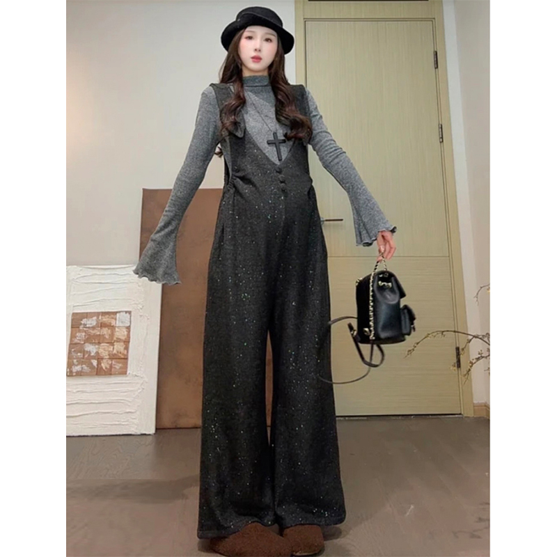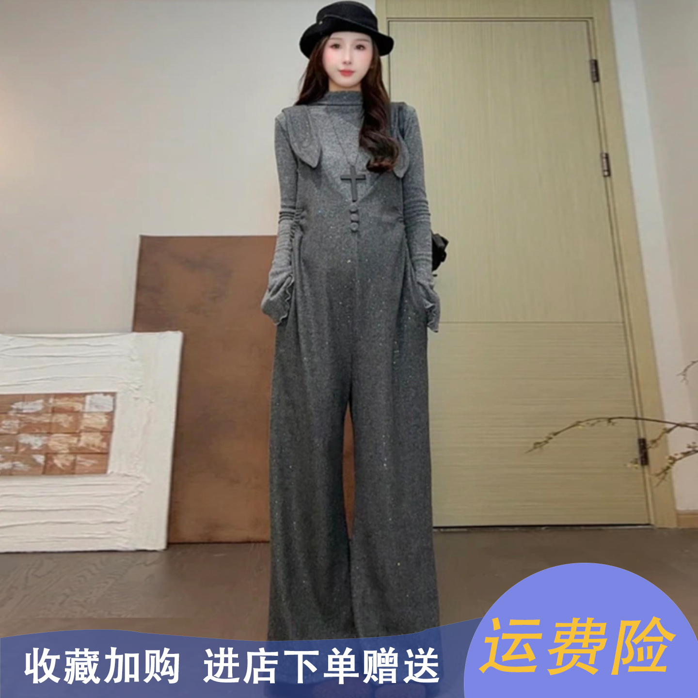 天猫孕妇深灰色套装秋冬2025新款时尚洋气高级感加绒加厚背带裤两件套