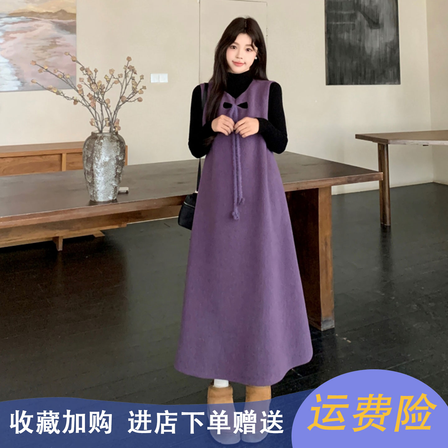 淘宝孕妇连衣裙紫色套装秋冬2025新款韩版潮妈减龄高级感背带裙两件套