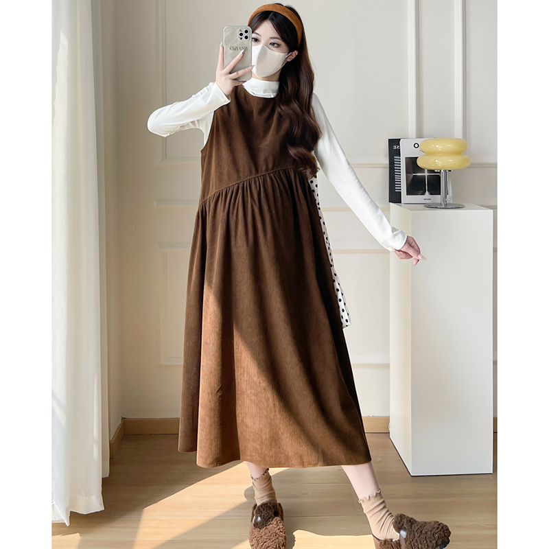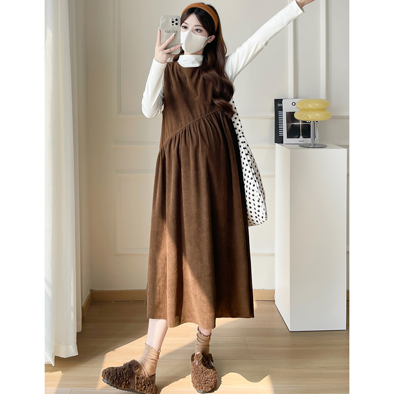 天猫孕妇连衣裙套装2025新款韩版咖色灯芯绒背带裙打底衫两件套秋冬季