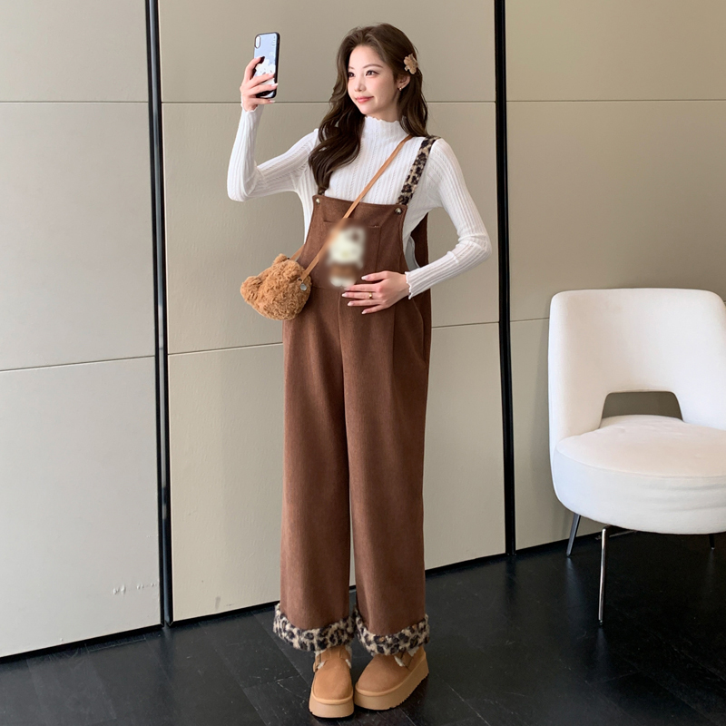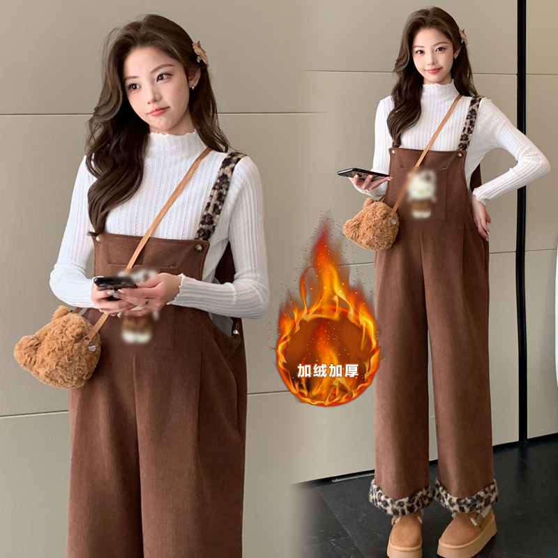 淘孕妇套装秋冬2025新款灯芯绒布朗棕加绒加厚潮妈背带裤毛衣两件套